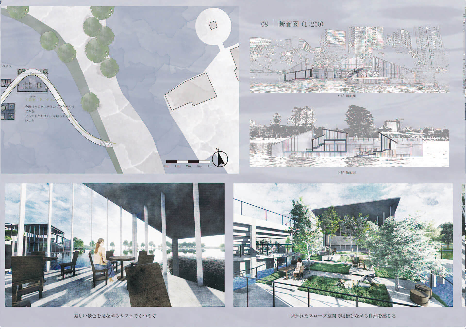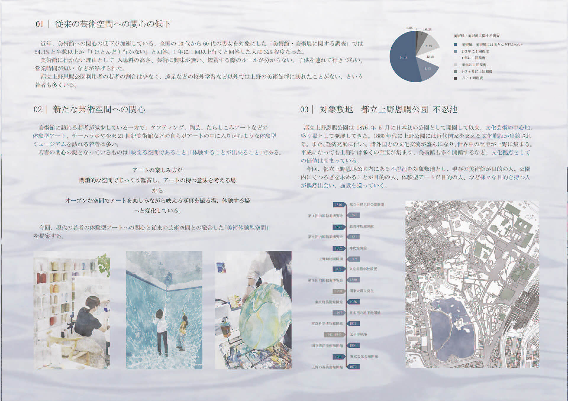 木々の縫い目に誘い込まれるように足を進めると美術館があった。人々は不忍池の上で新たな芸術文化と出会う。水上での一筋の散策路で、鑑賞体験が展開されていく。