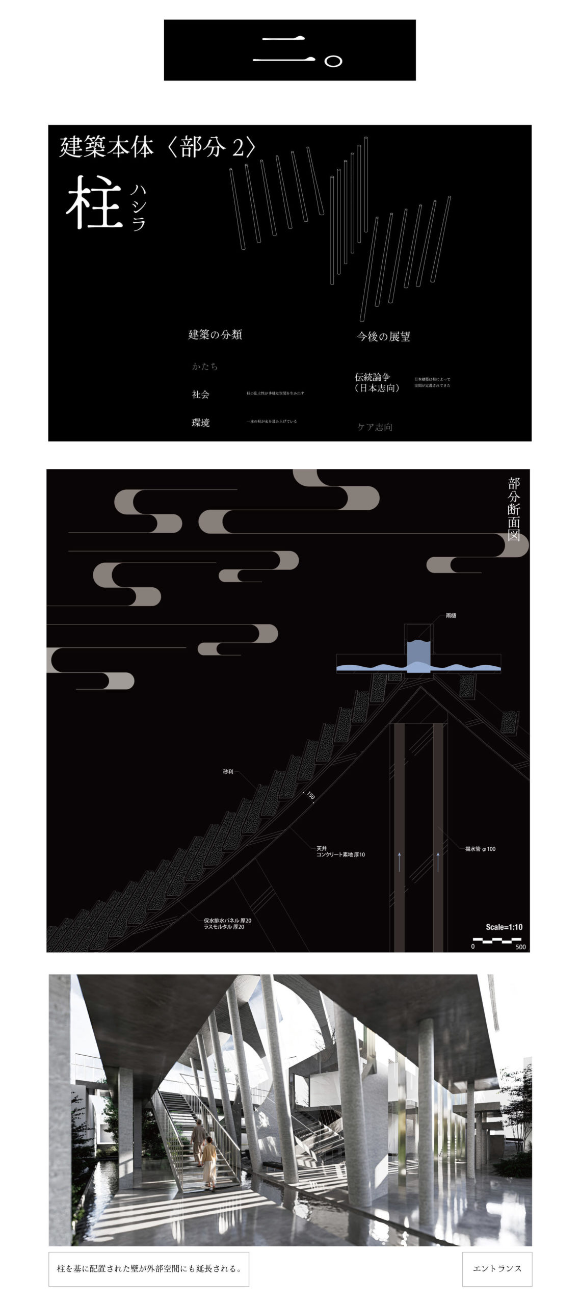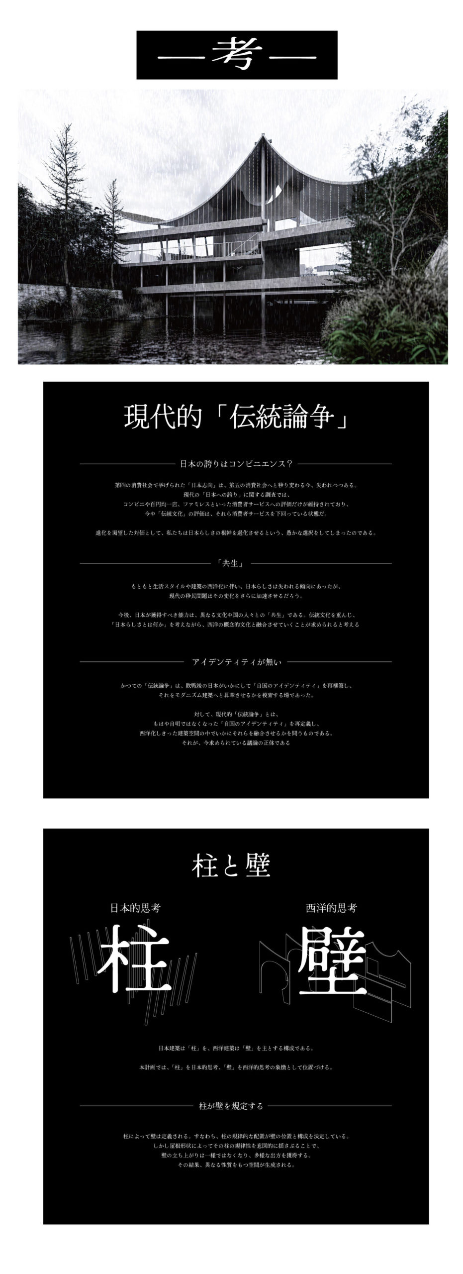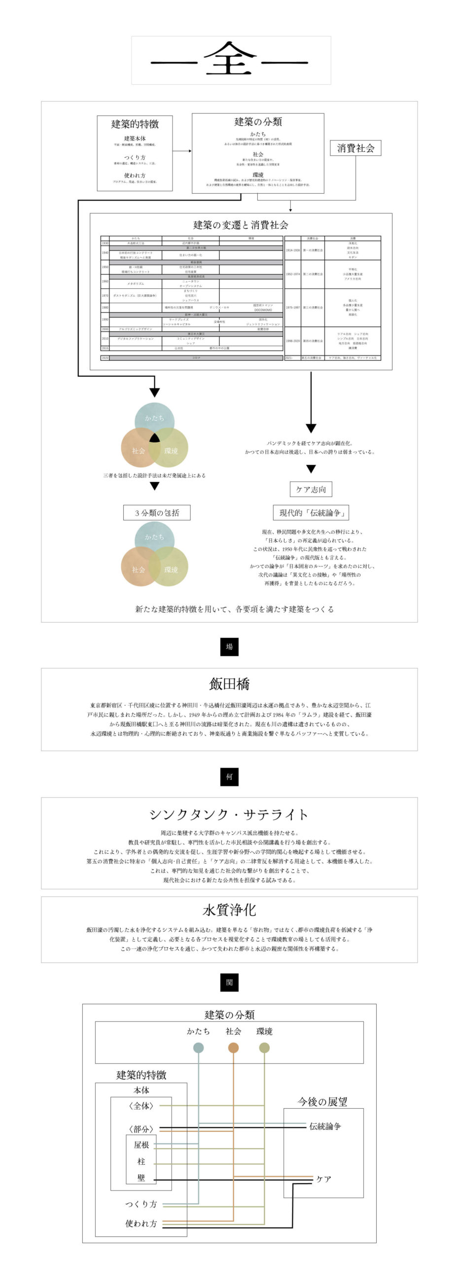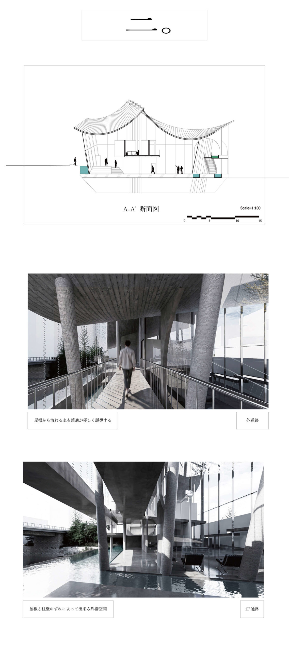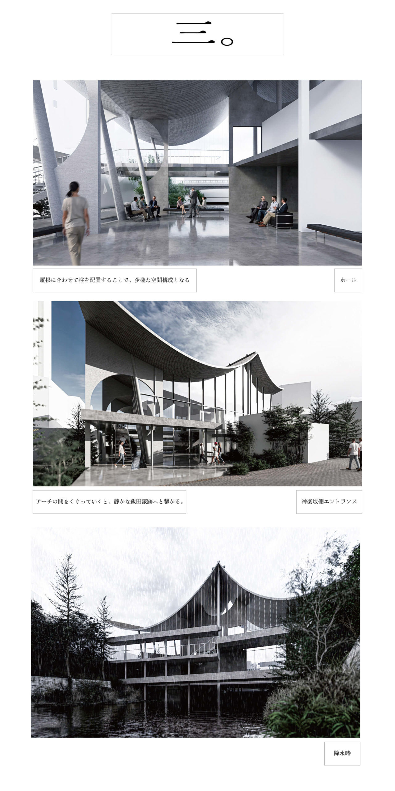 和洋融合(かたち)、知の拠点(社会)、水質浄化(環境)を統合。屋根の不均質な形が柱・壁へと連鎖する設計により多文化共生を包容する、次世代の建築を飯田橋に提案する。