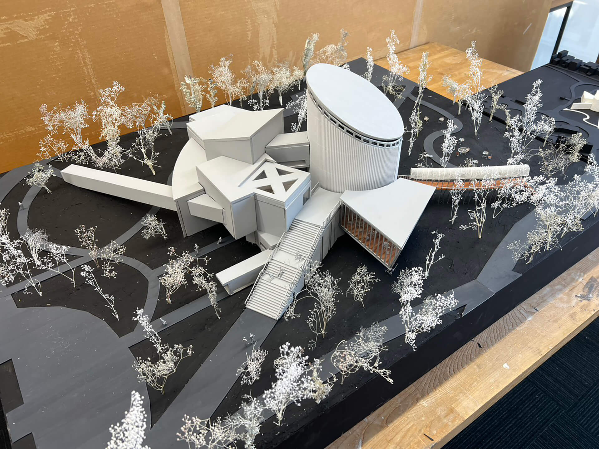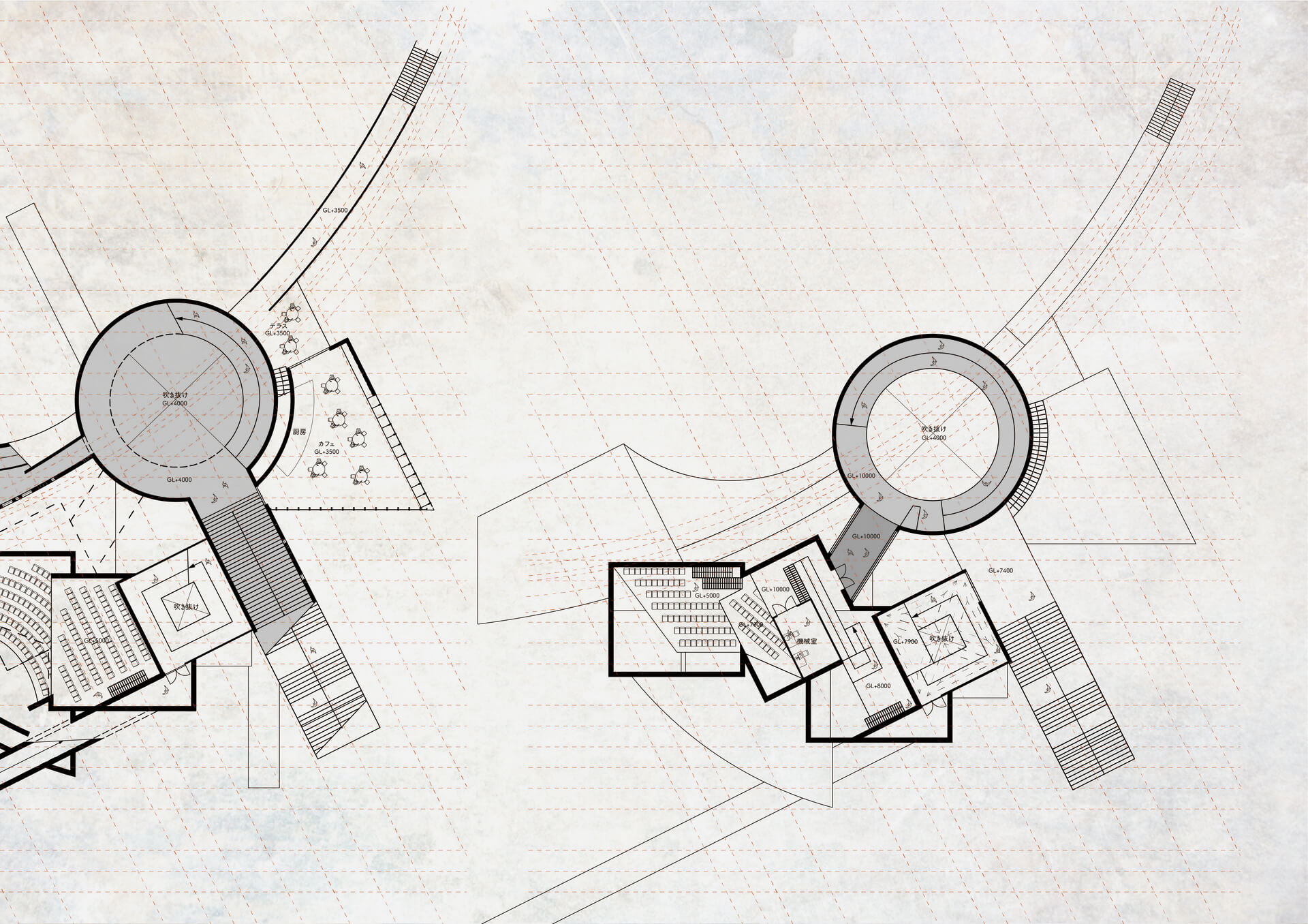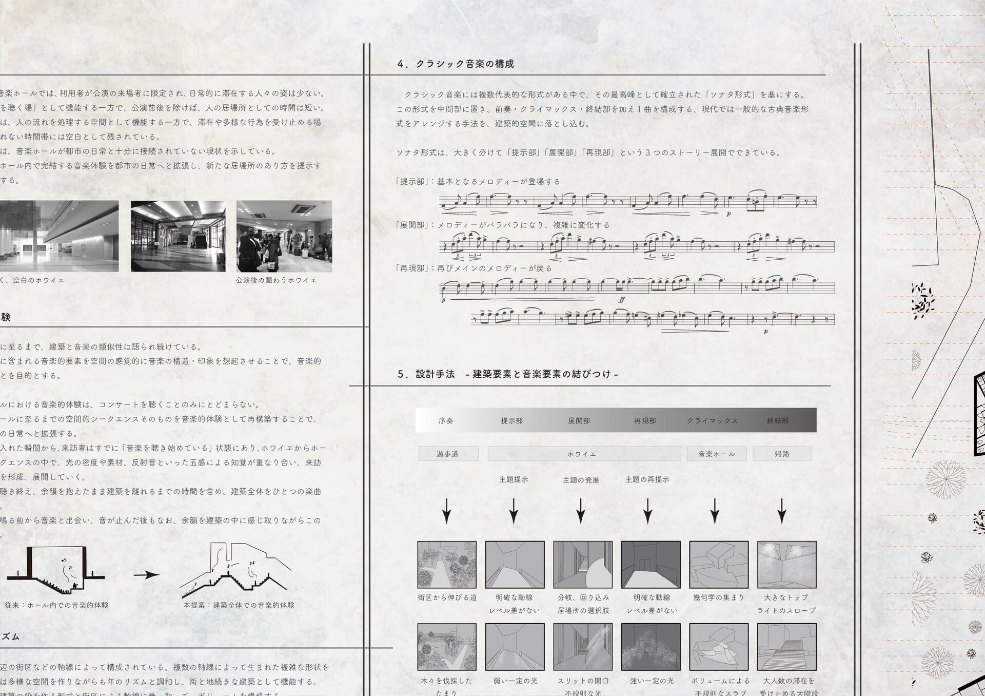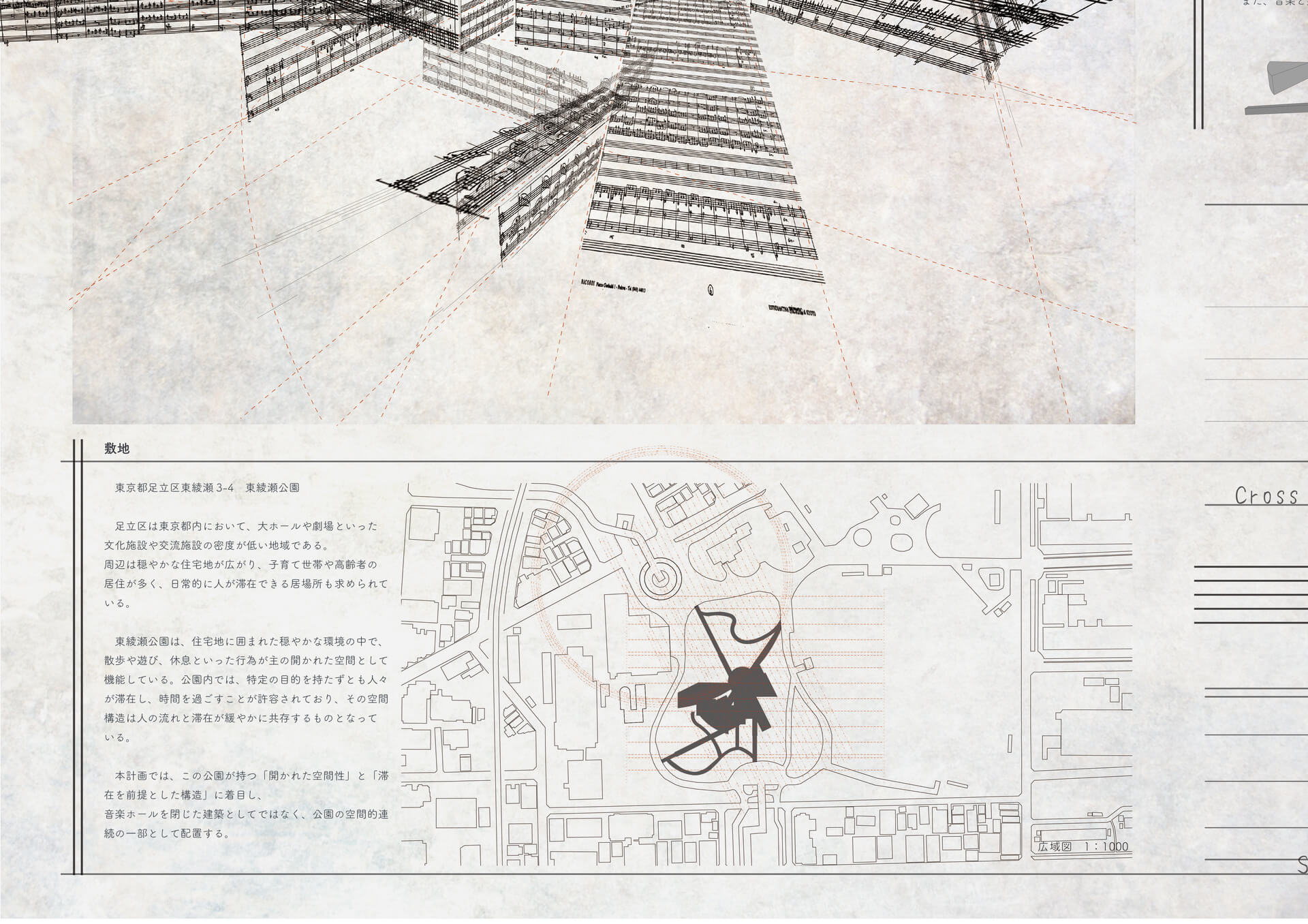 音楽の構造を空間操作に重ねることで、演奏の場と日常の風景は連続する その連なりの中で、音楽的体験は建築全体に輪郭を与え、空間の構成として立ち上がる