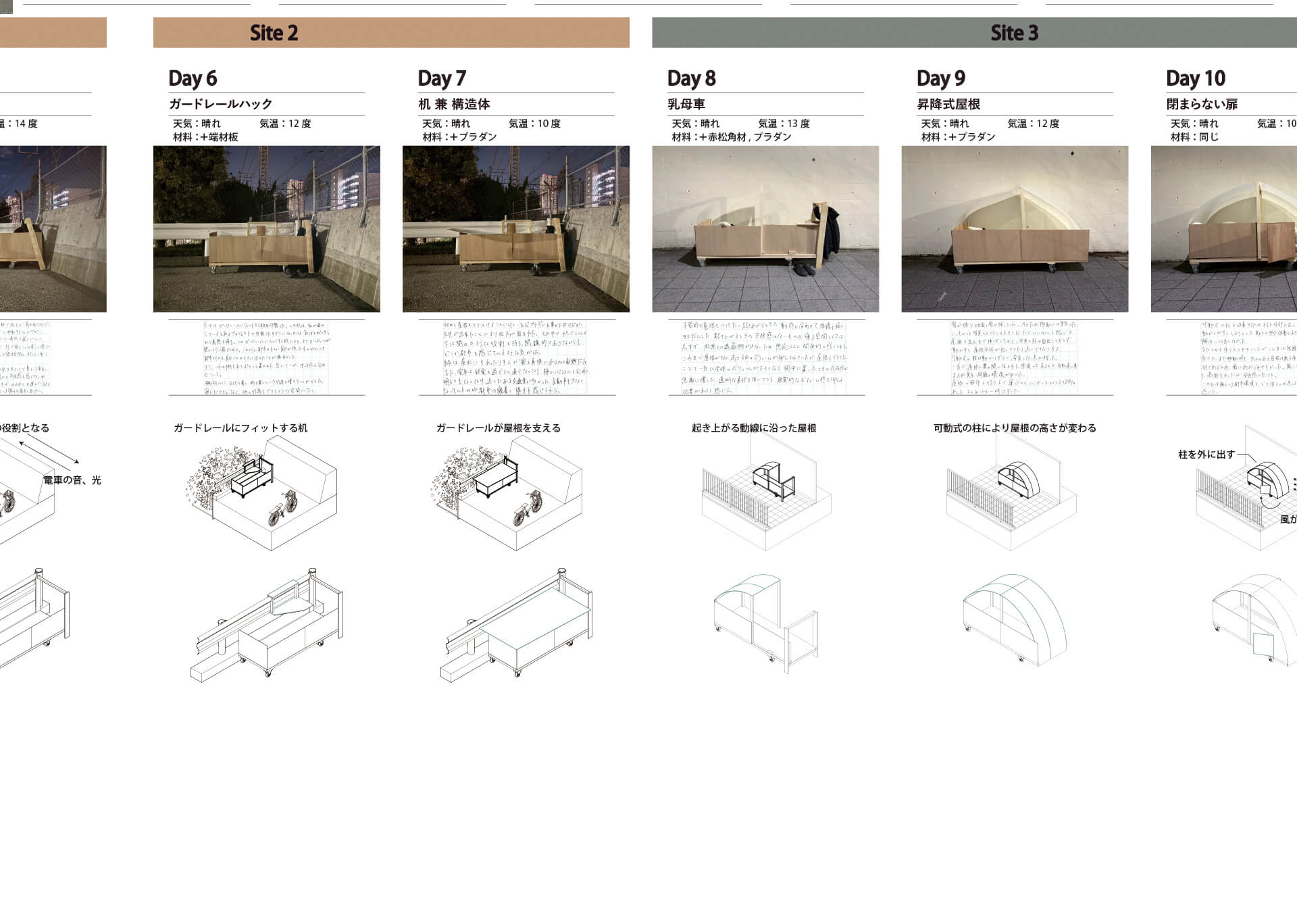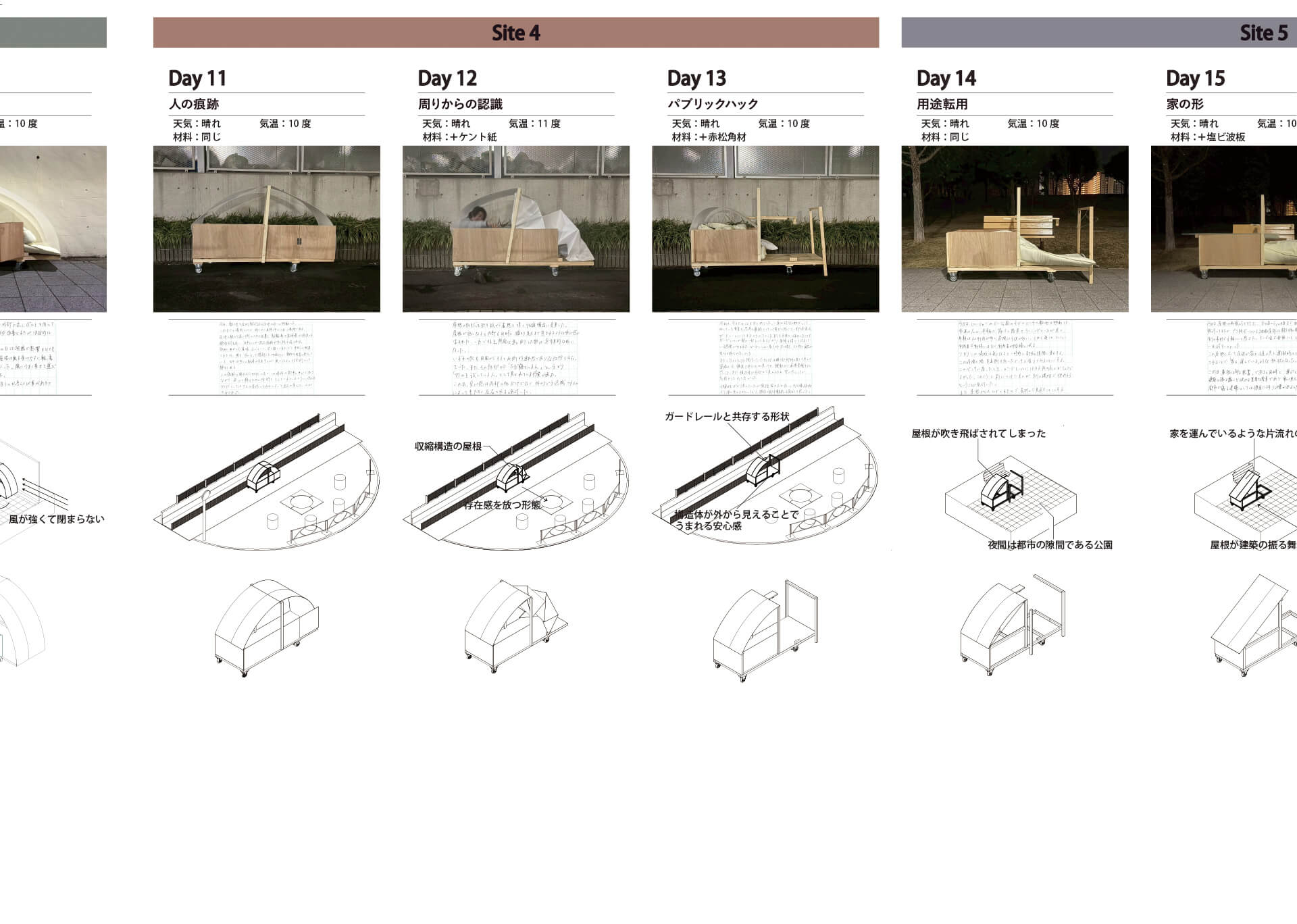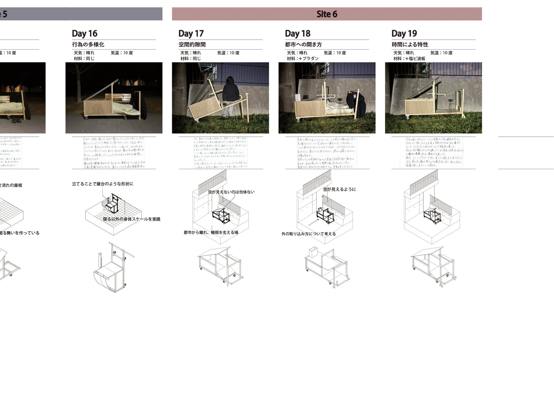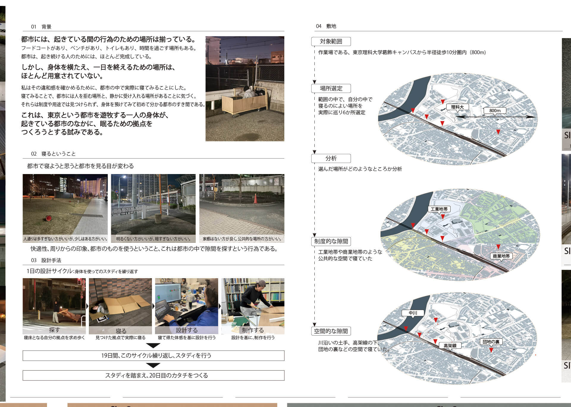起きる行為に最適化された都市で、実際に寝てみる。身体を預けて初めて見える、制度に現れない受容と拒絶の差異=都市のすき間を探る試みを記録し、立ち上げる。