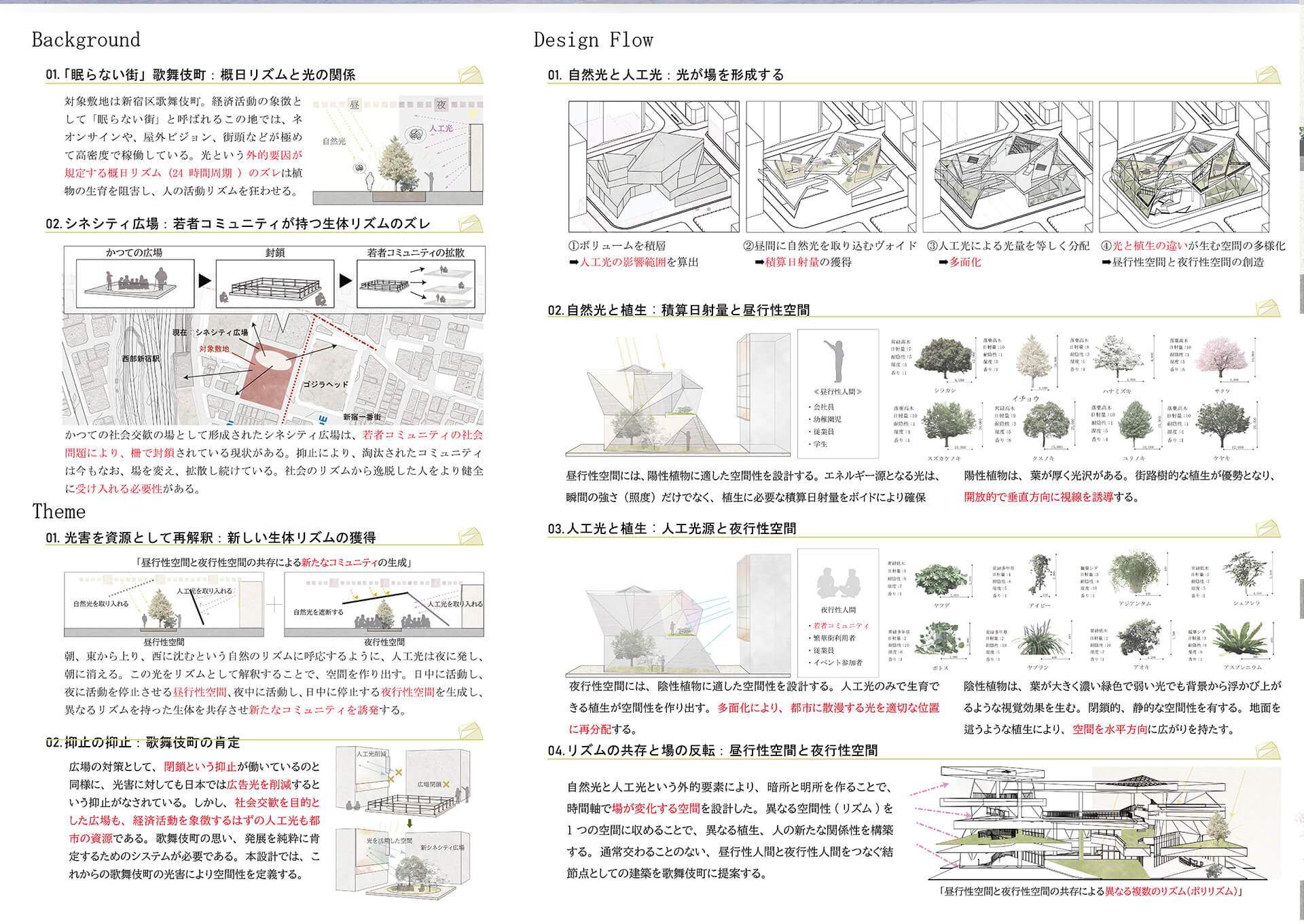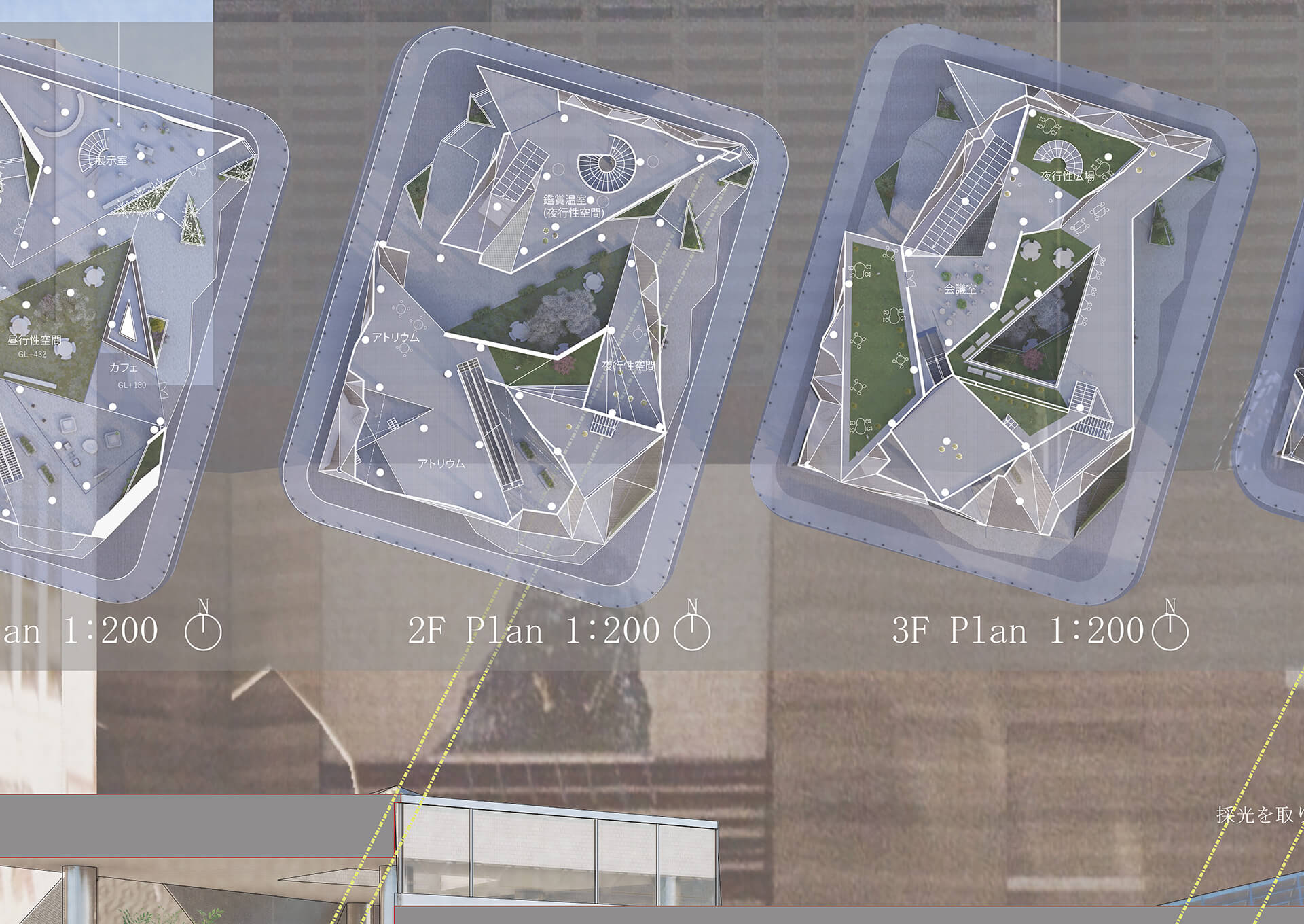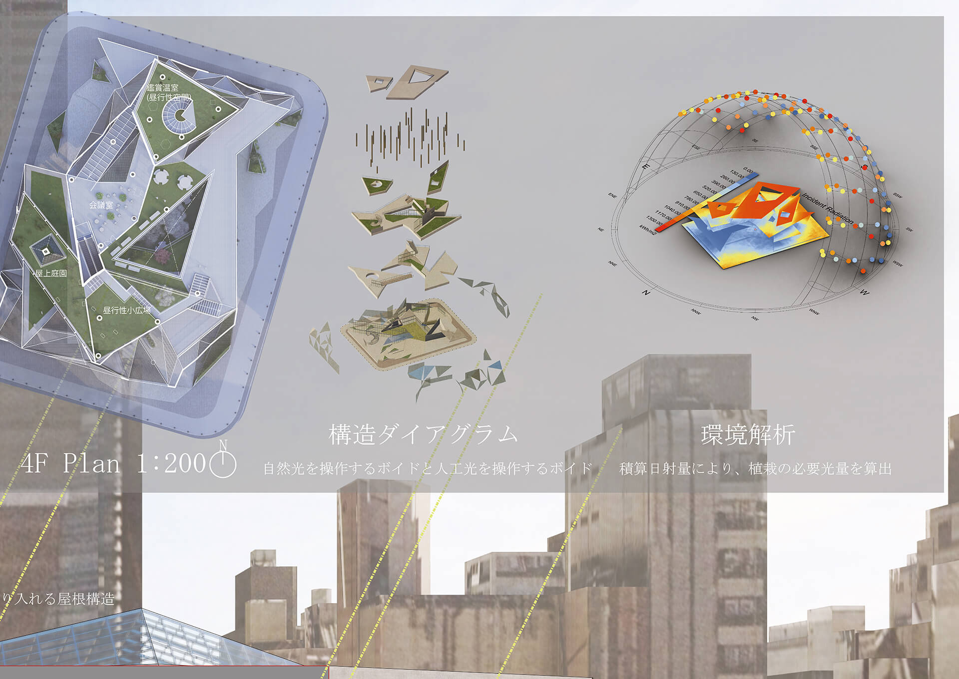 都市の輝きが生き物の輝きを奪っている。本設計は過剰な人工光を資源として再解釈し、人と植物が自律的に生きる新たな生体リズムを持つ場を提案する。
