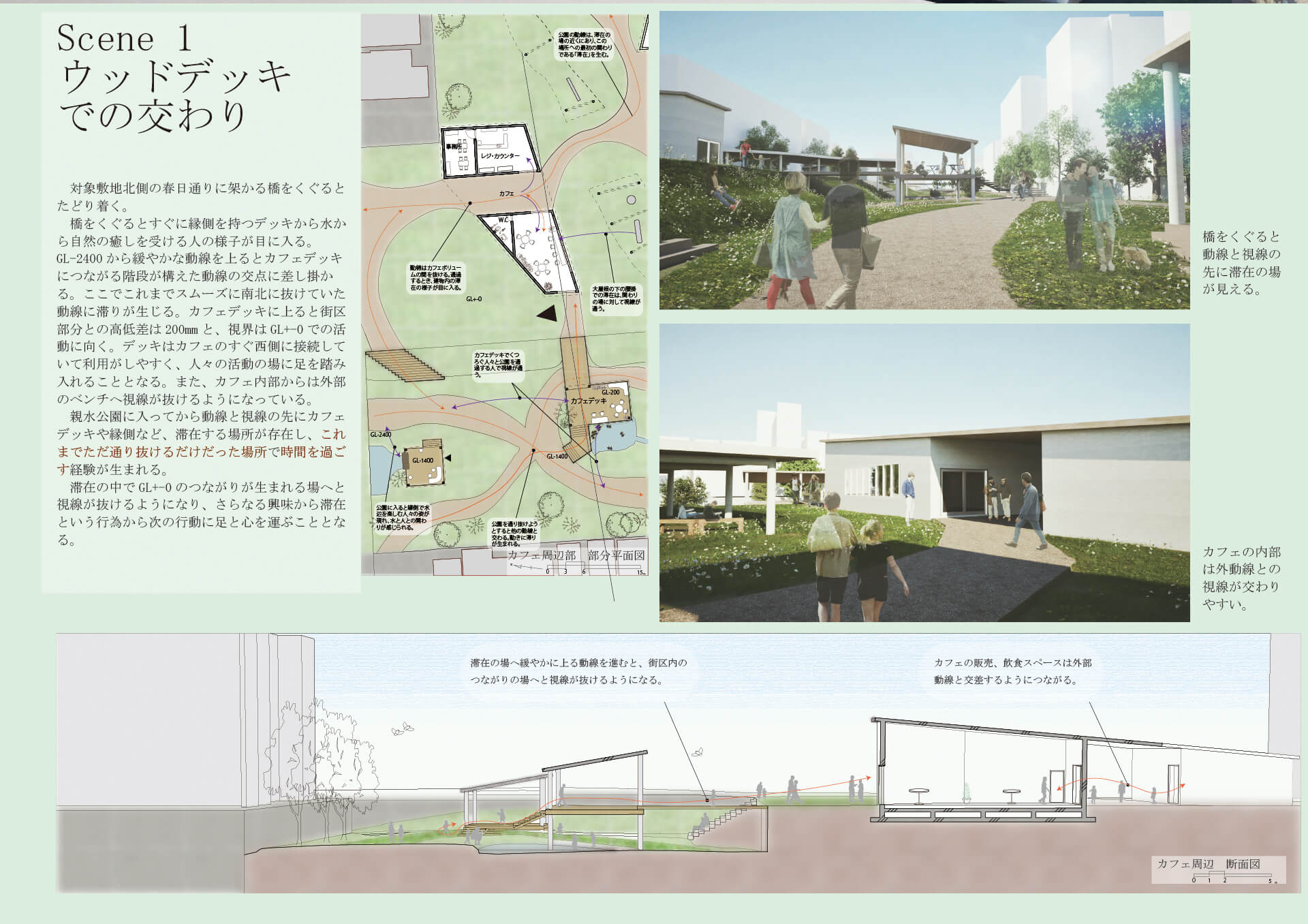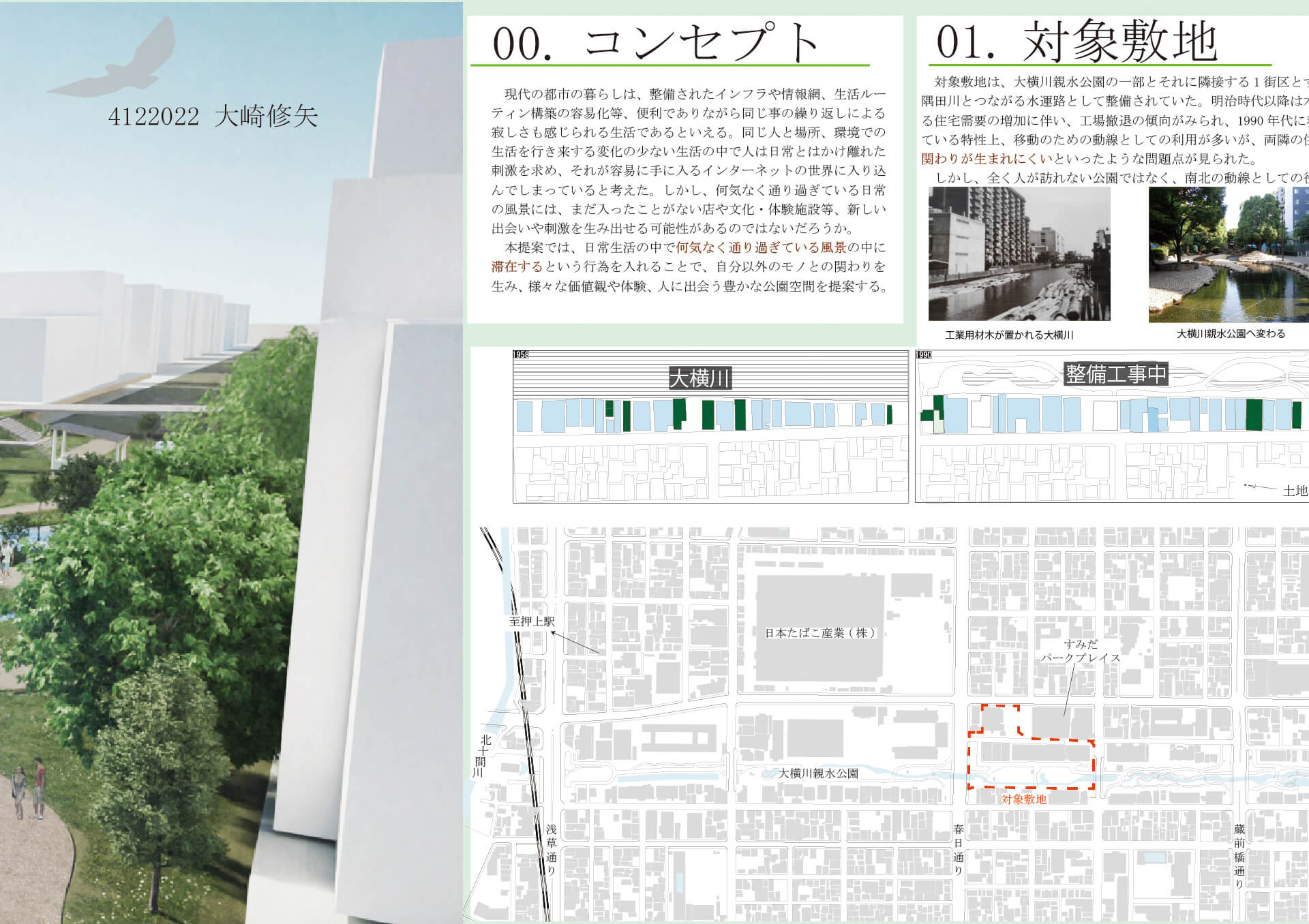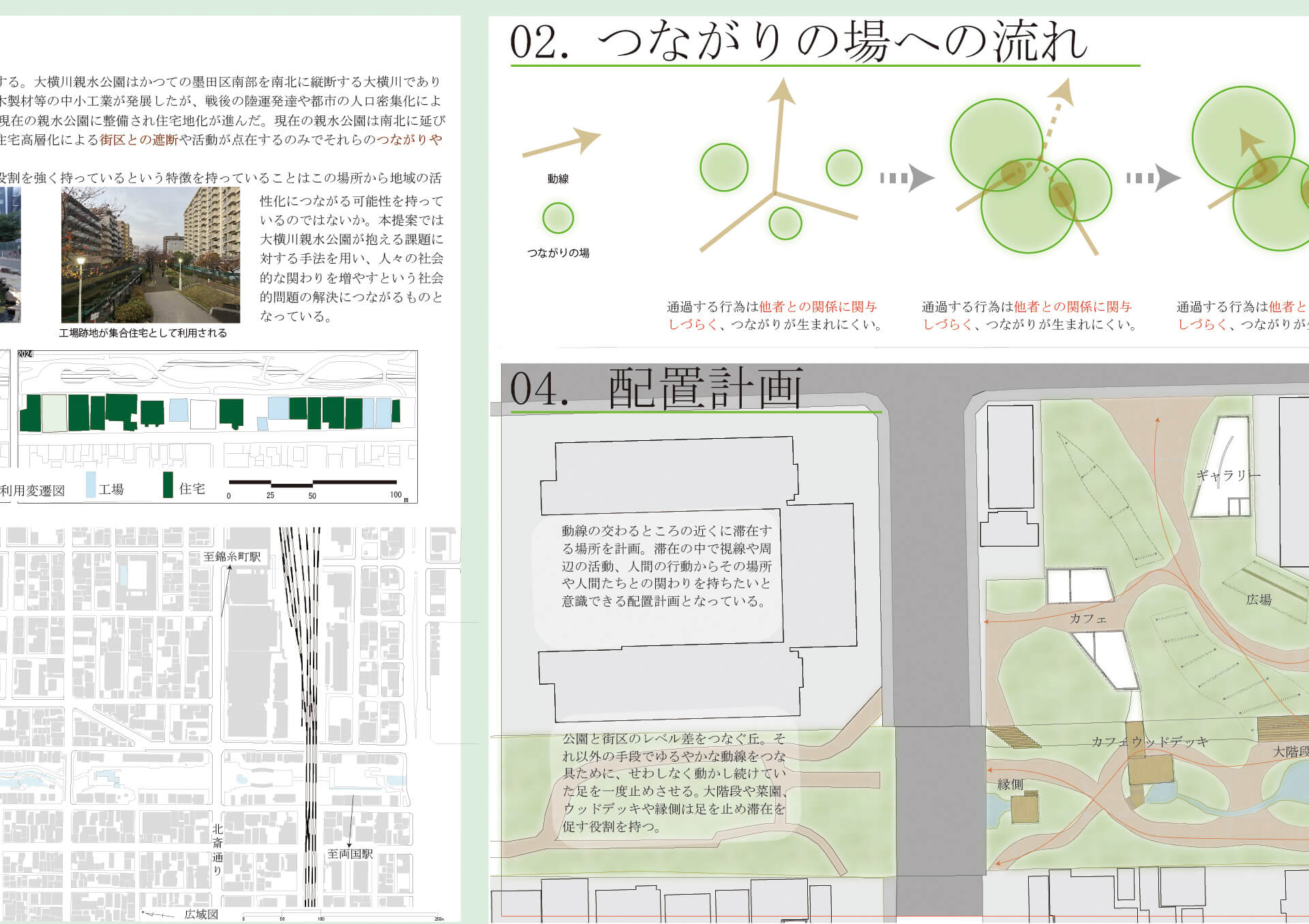 都市の日常で通り過ぎられてきた親水公園に境界建築を挿入し、関与を強制しない滞在のあわいをつくることで、人や価値観との新たな縁に出会う場を提案する。