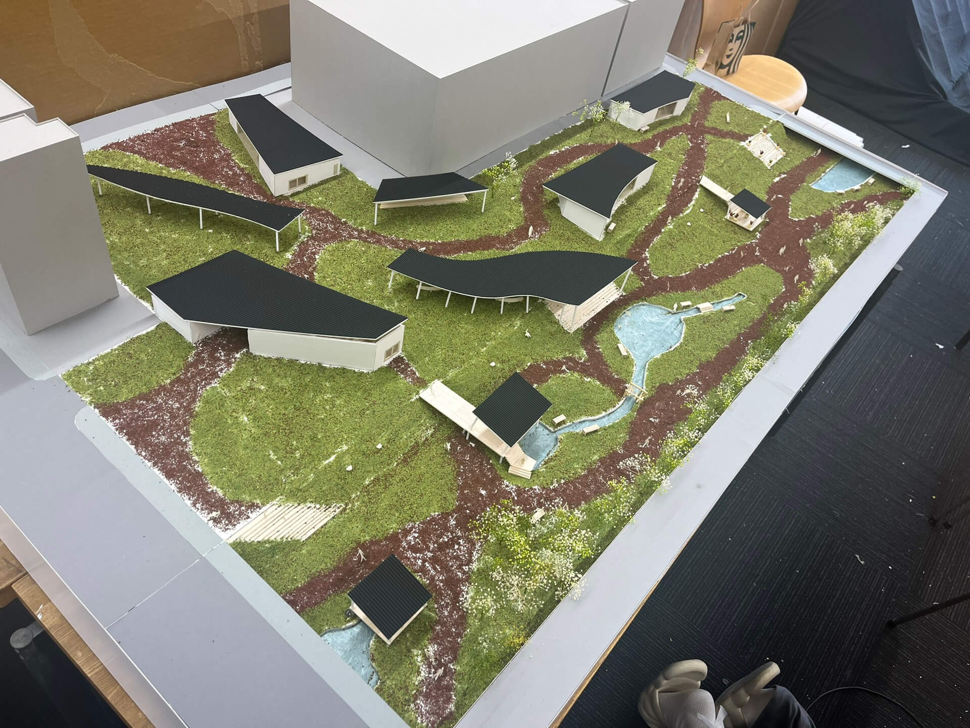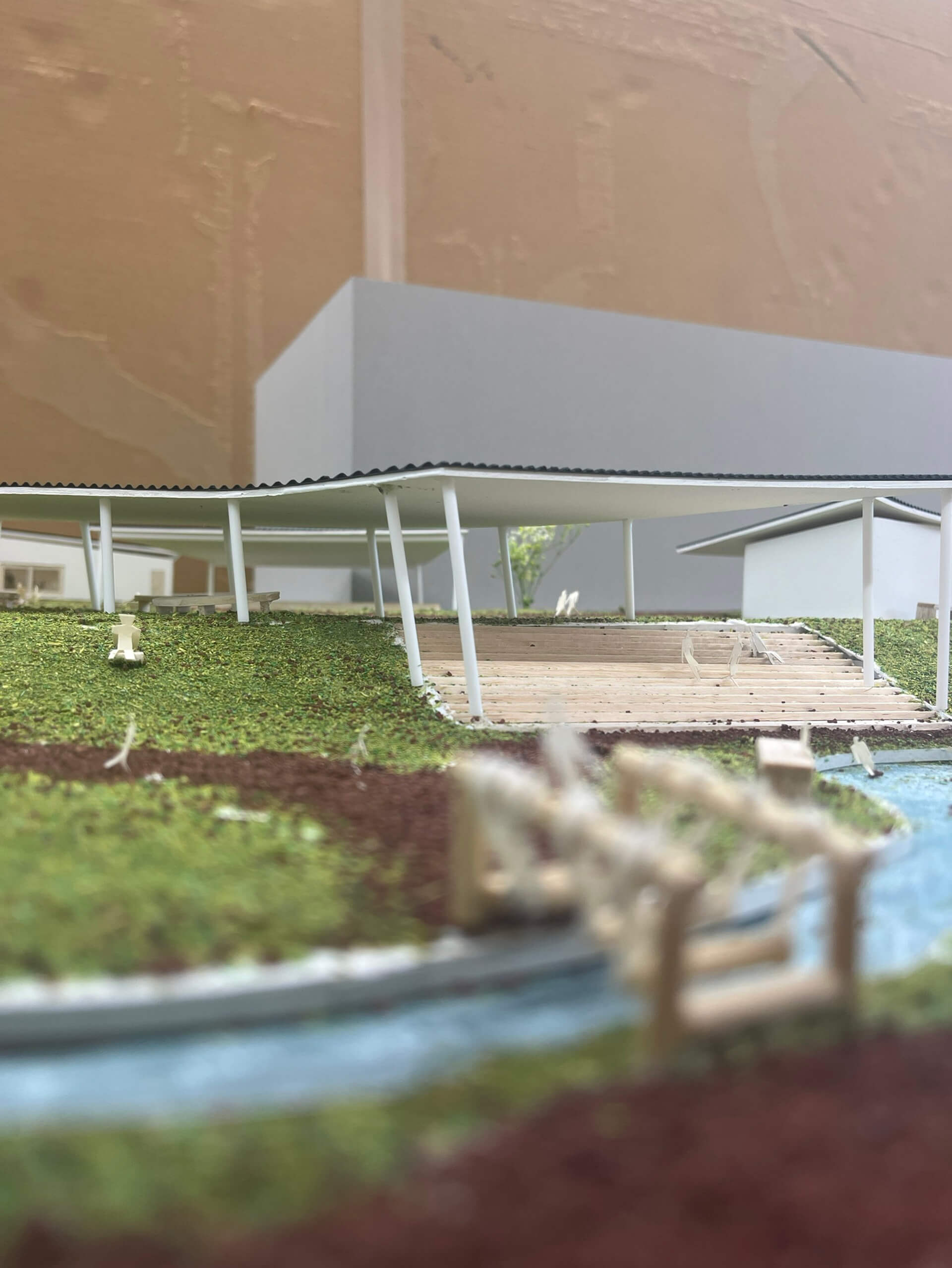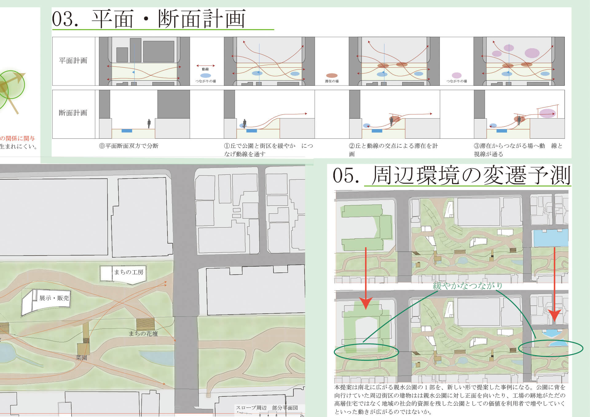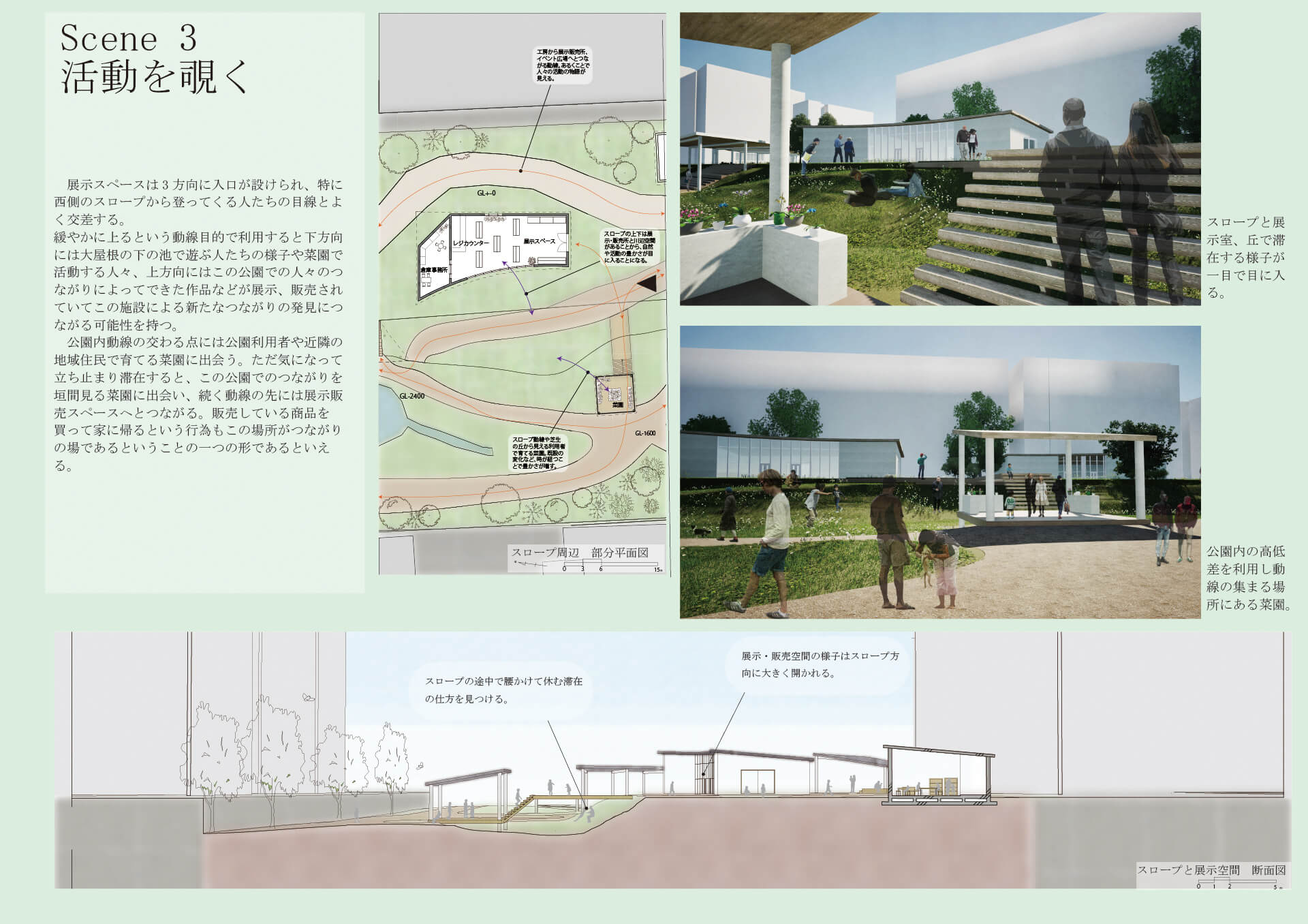 都市の日常で通り過ぎられてきた親水公園に境界建築を挿入し、関与を強制しない滞在のあわいをつくることで、人や価値観との新たな縁に出会う場を提案する。