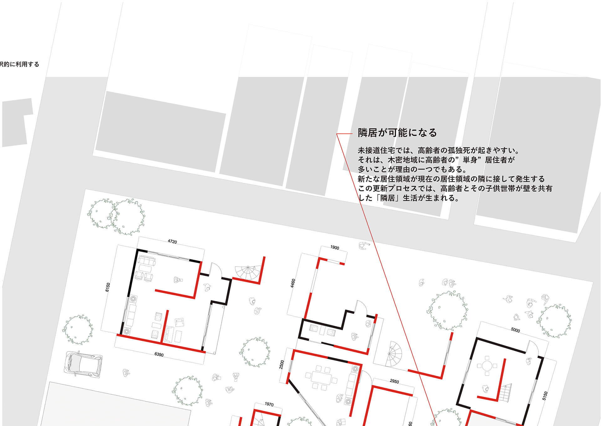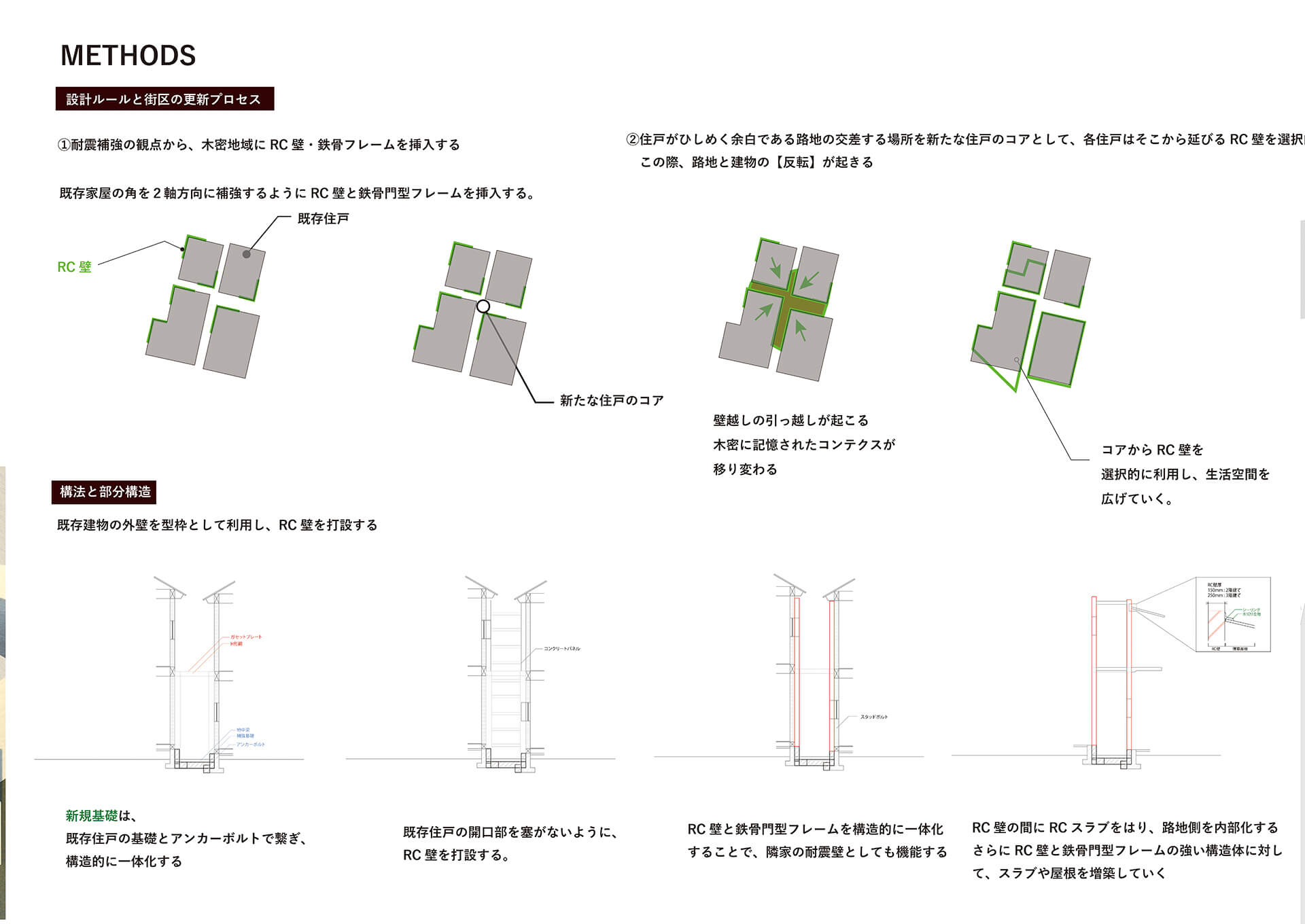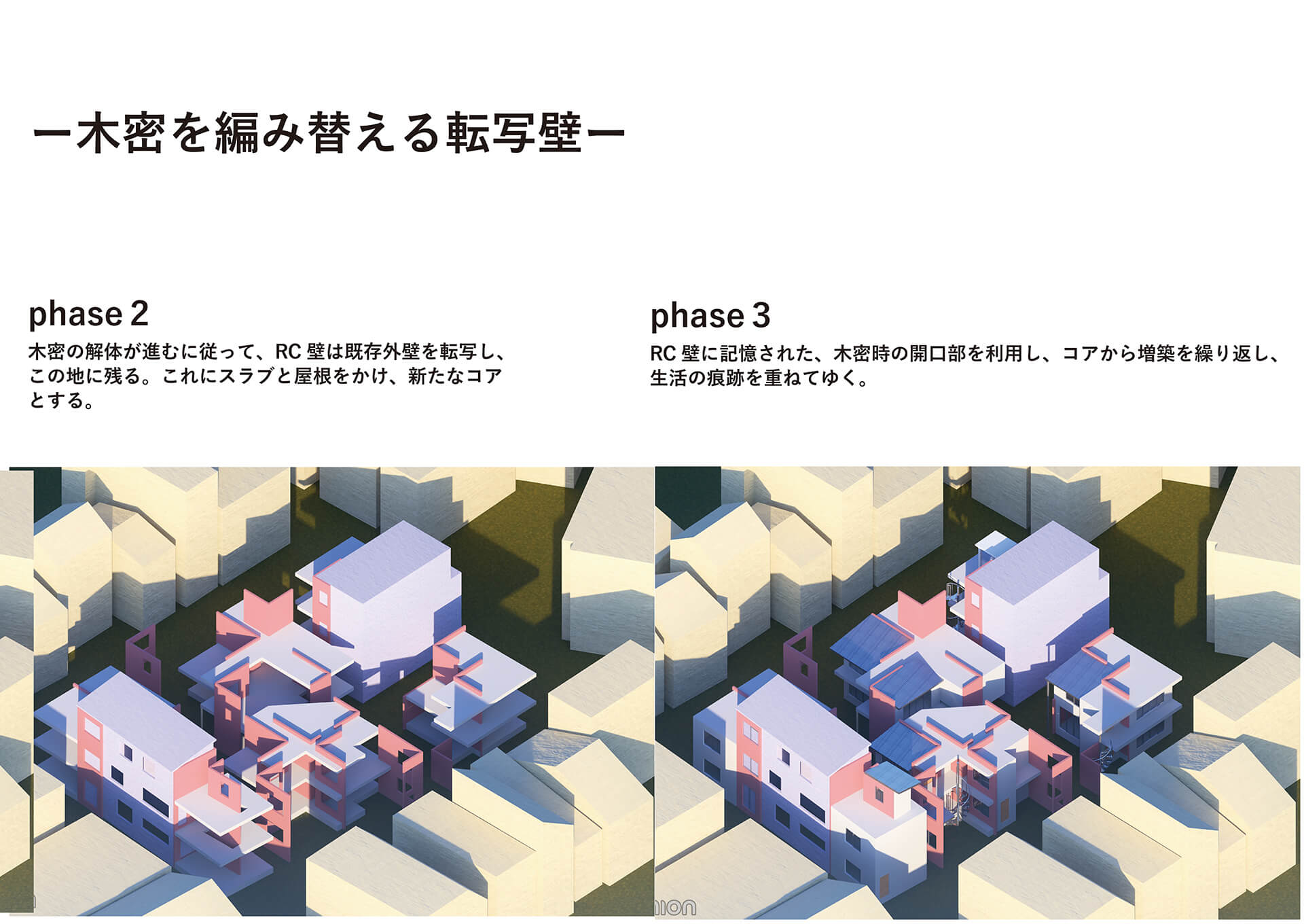 RC壁に木密時の開口部を転写し、コアから増築を反復、生活痕跡を重ね、まちを更新する提案。