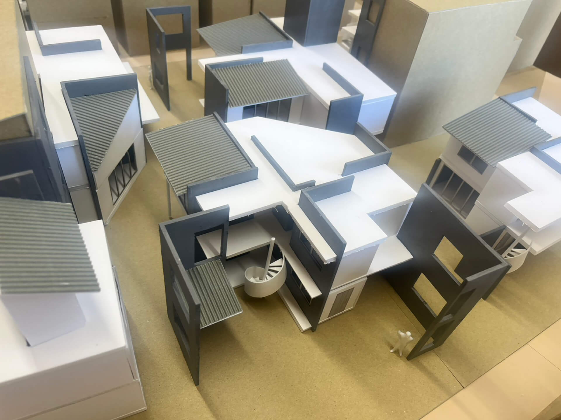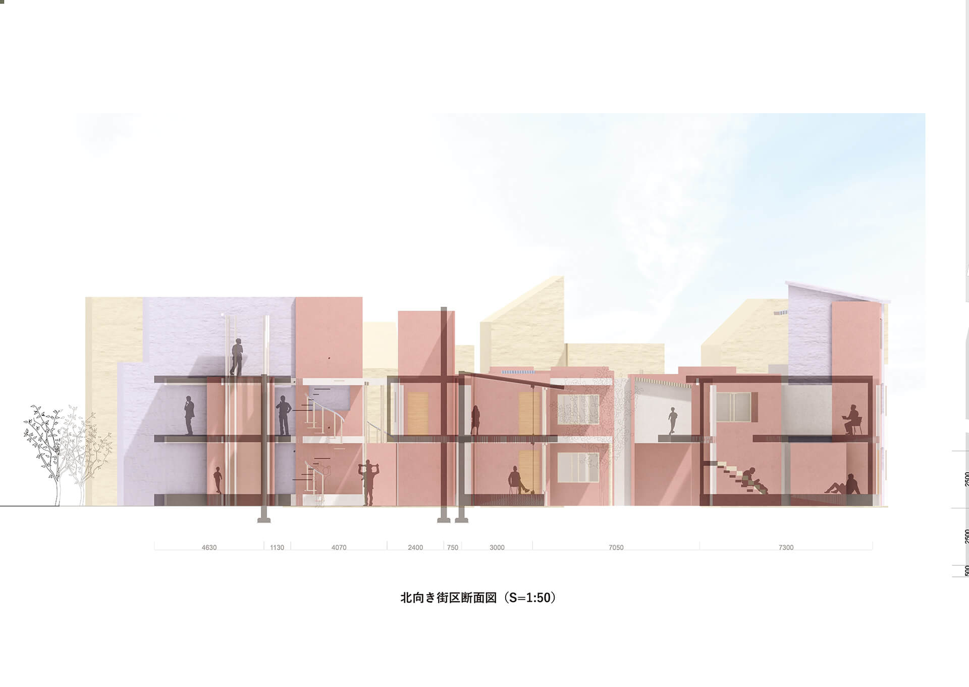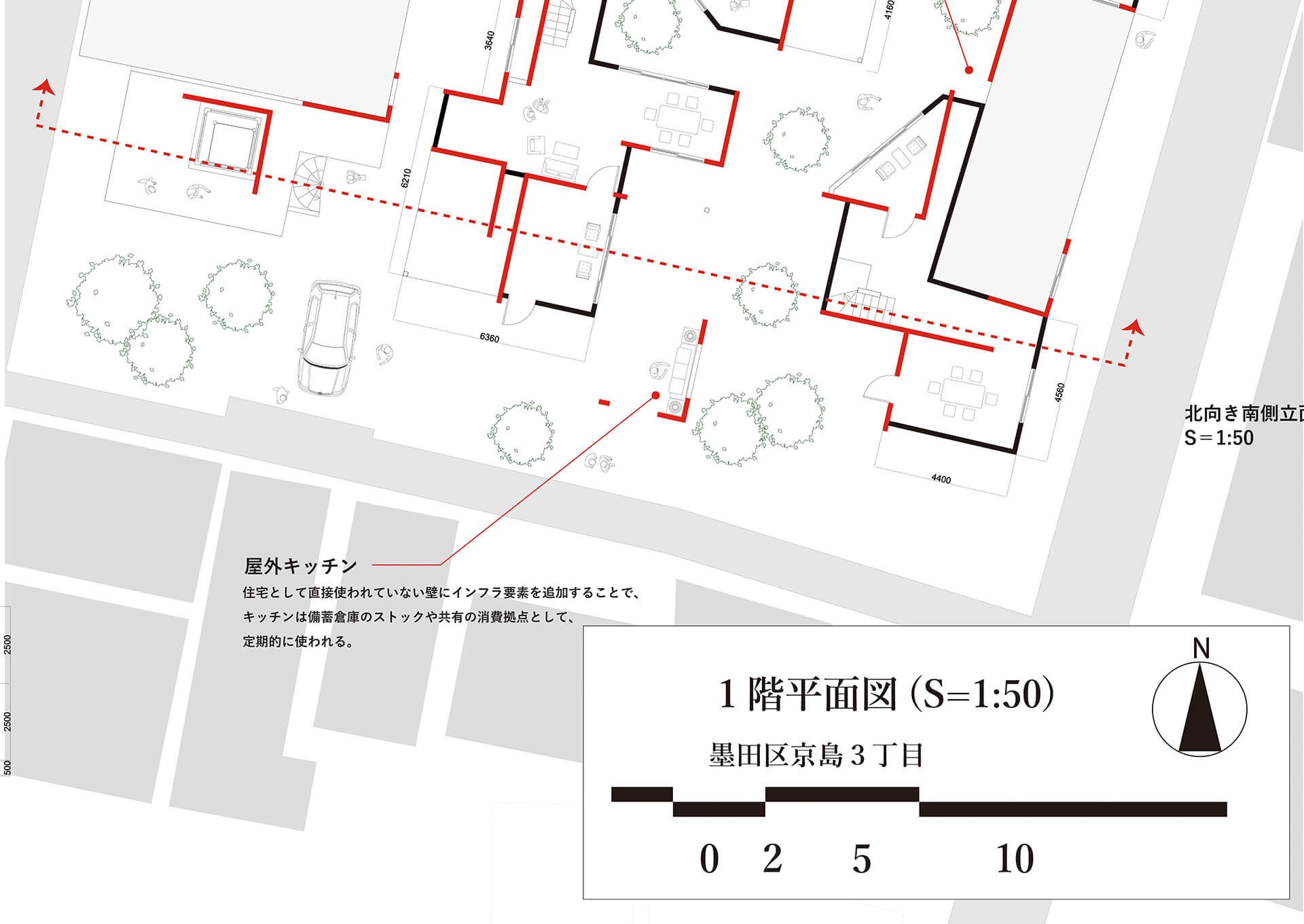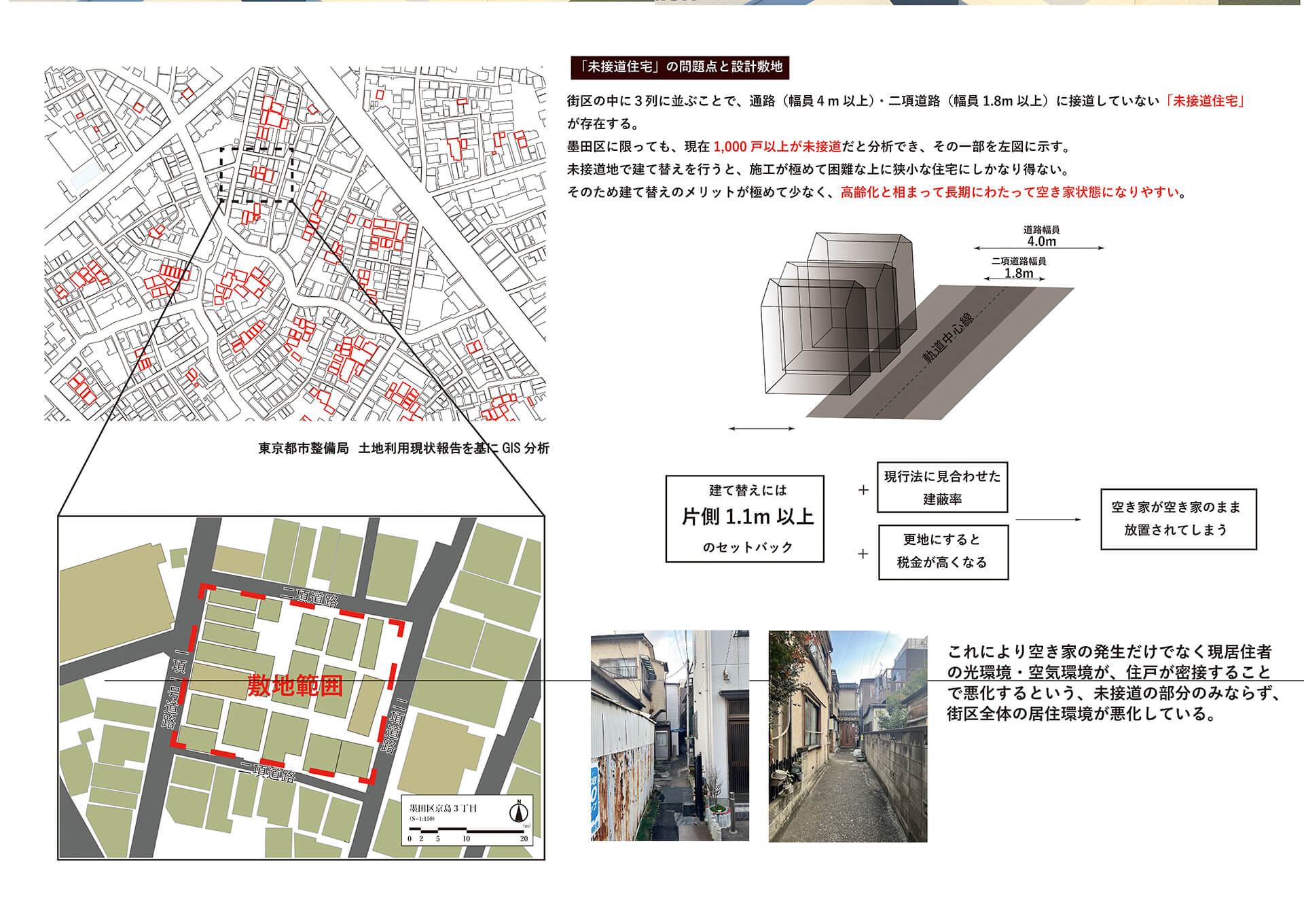 RC壁に木密時の開口部を転写し、コアから増築を反復、生活痕跡を重ね、まちを更新する提案。