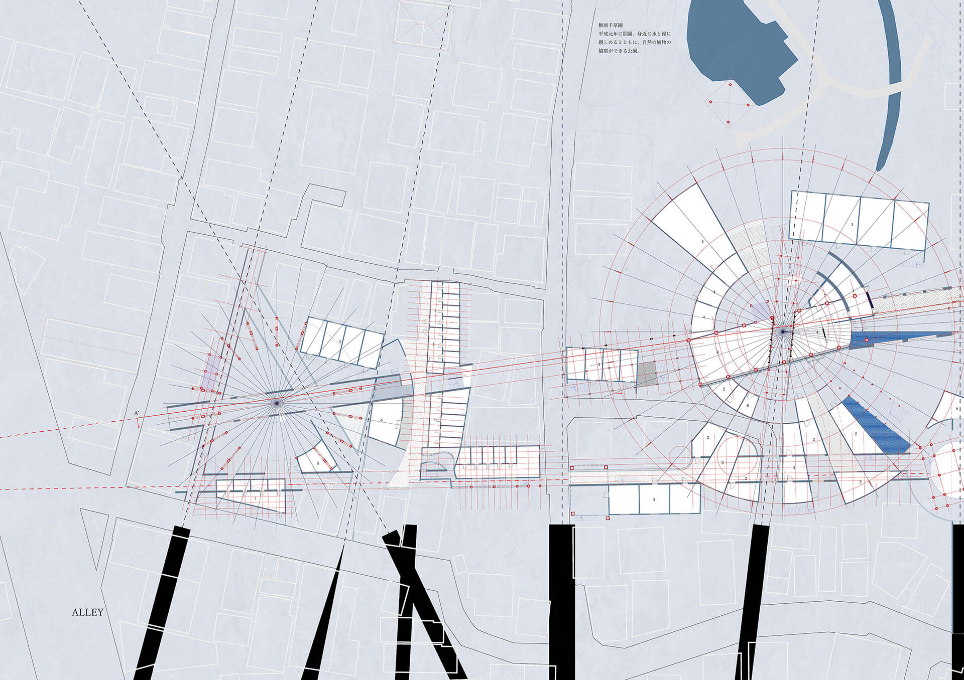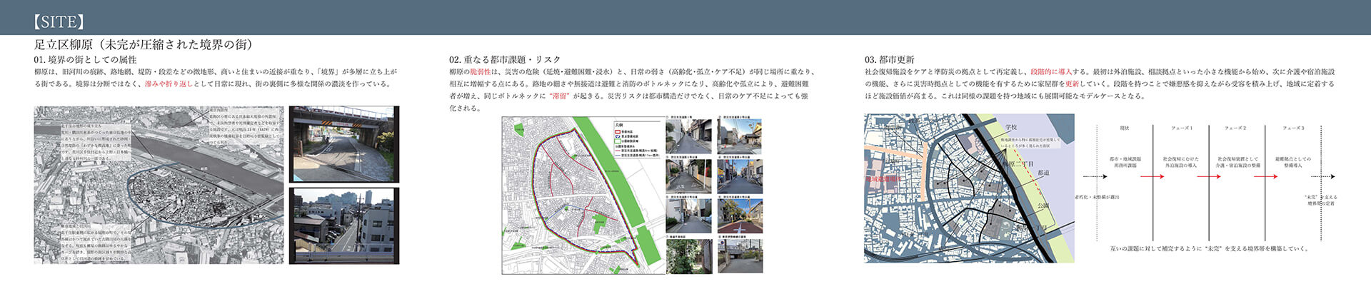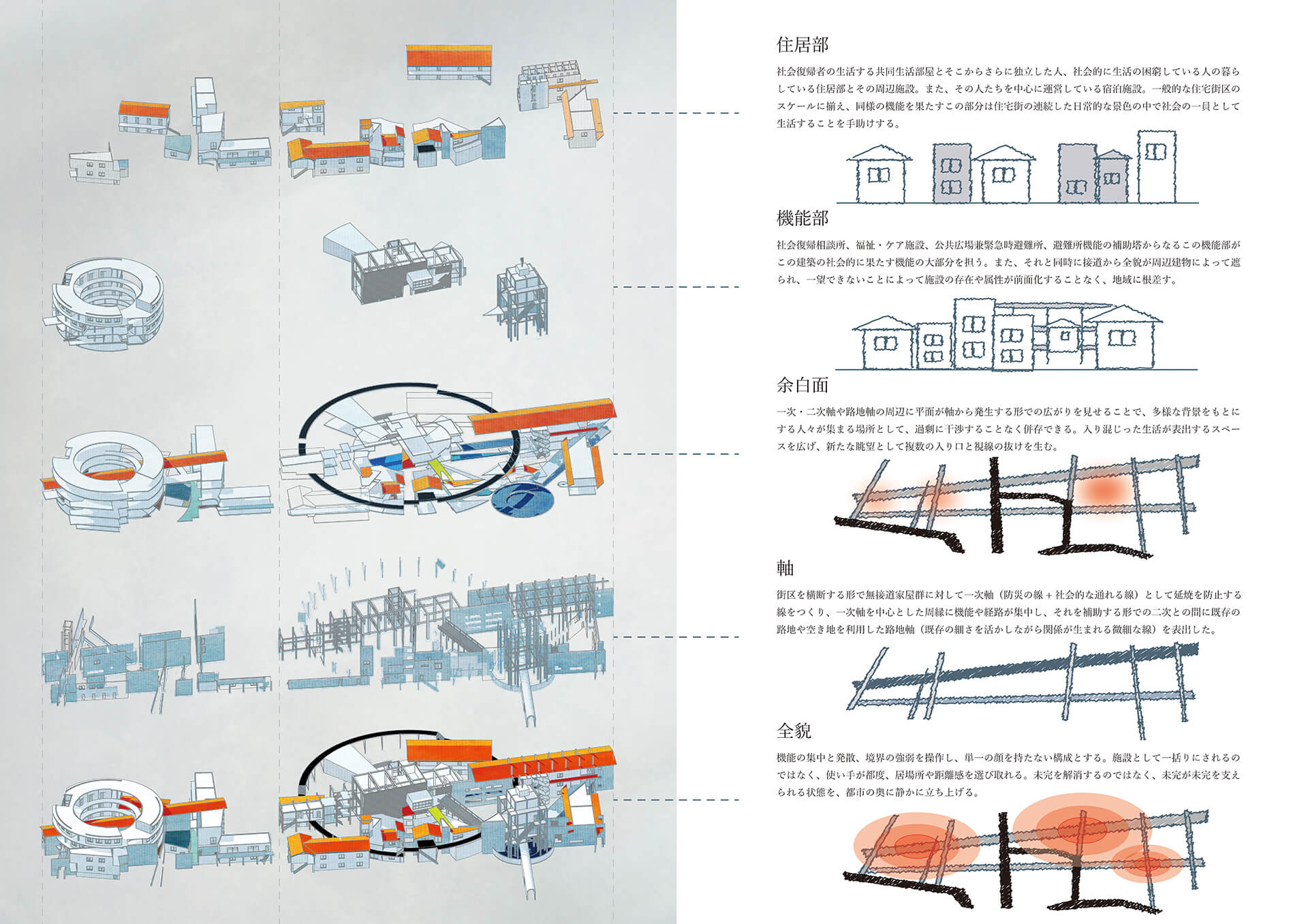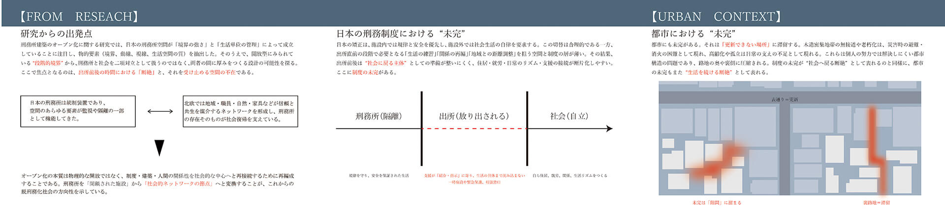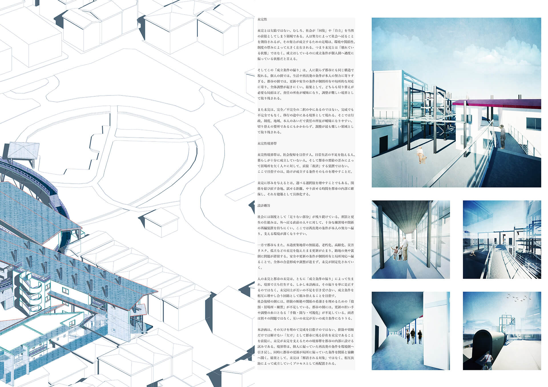 未完を欠陥ではなく努力への偏りが大きい余白と捉え、社会に残され続ける「足りない」存在が互いに支えるための境界帯を都市の内部に設ける試みである。