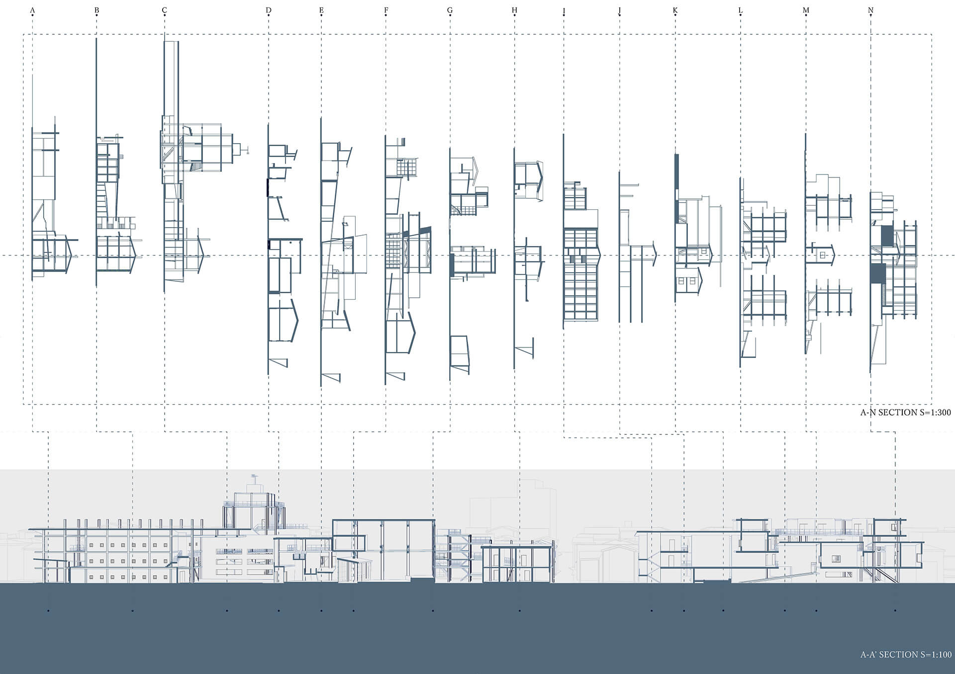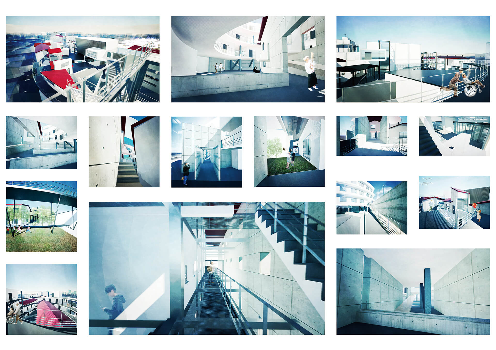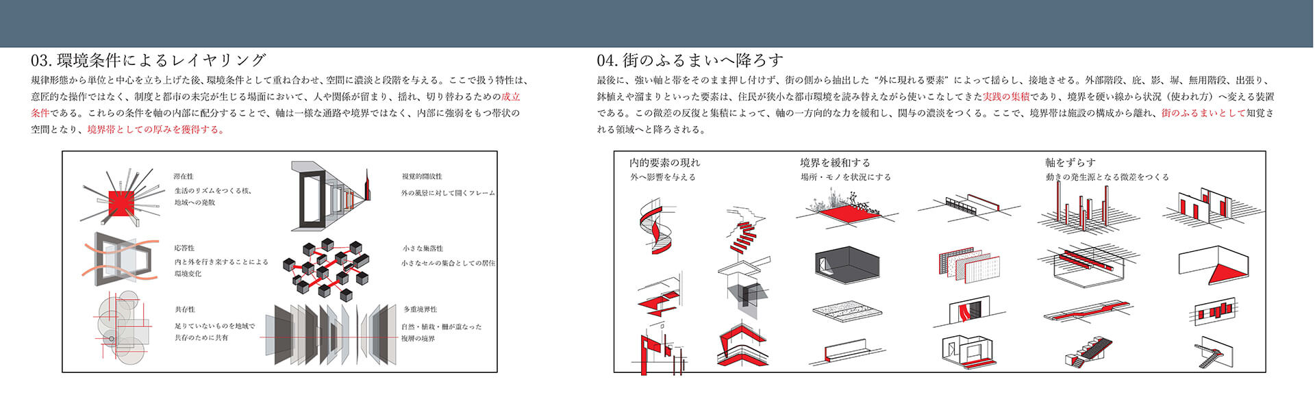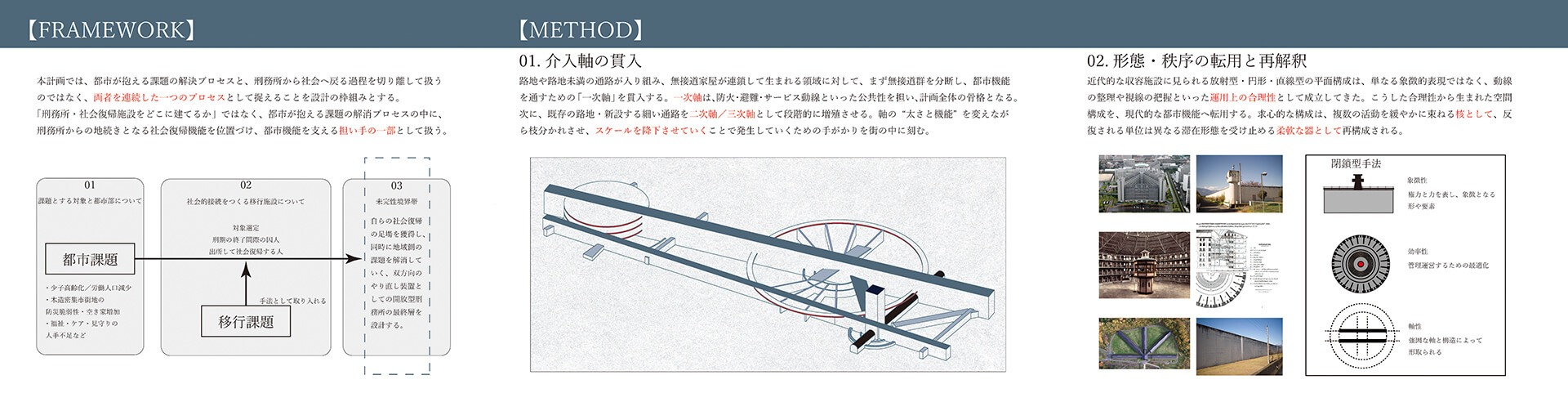 未完を欠陥ではなく努力への偏りが大きい余白と捉え、社会に残され続ける「足りない」存在が互いに支えるための境界帯を都市の内部に設ける試みである。