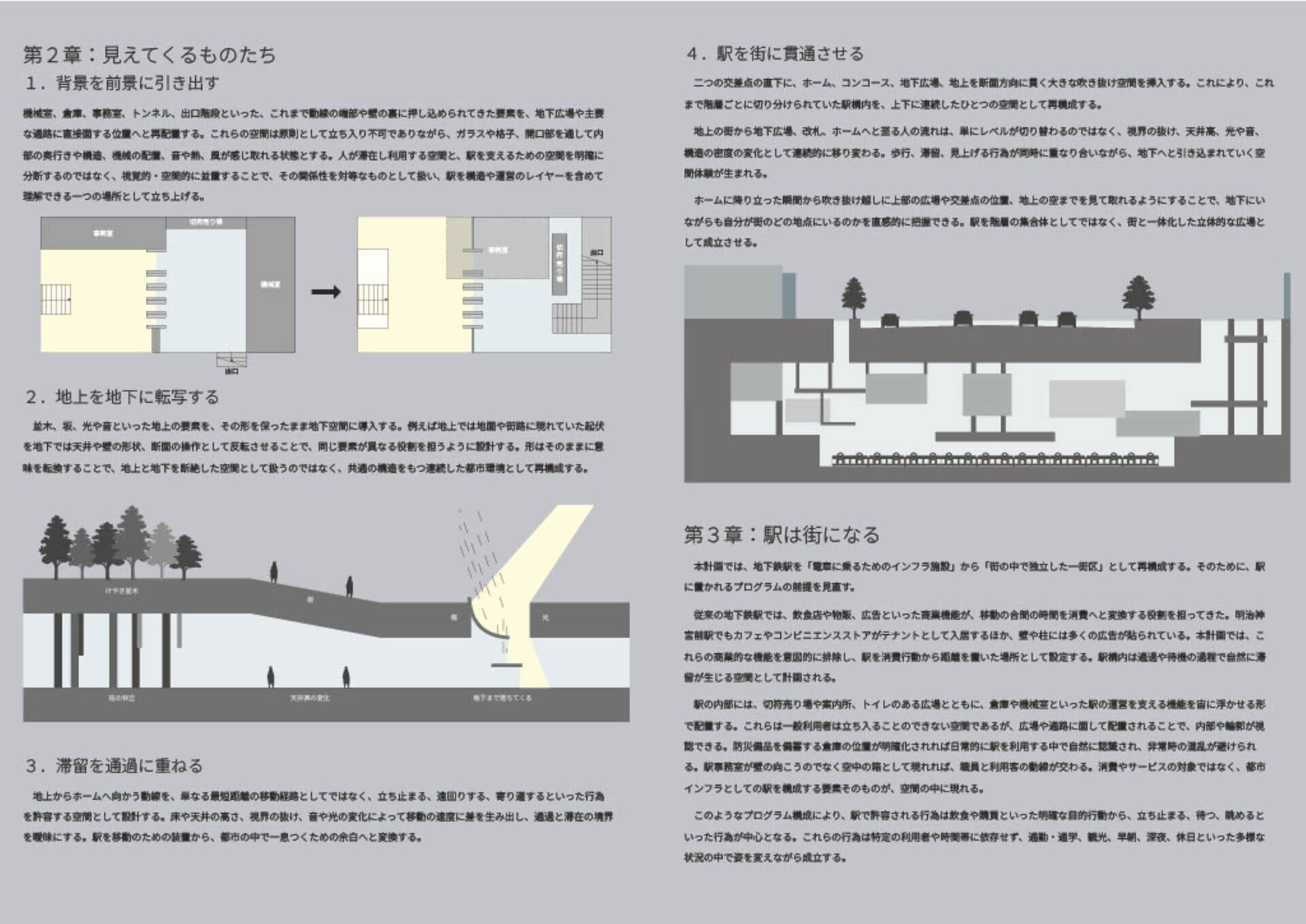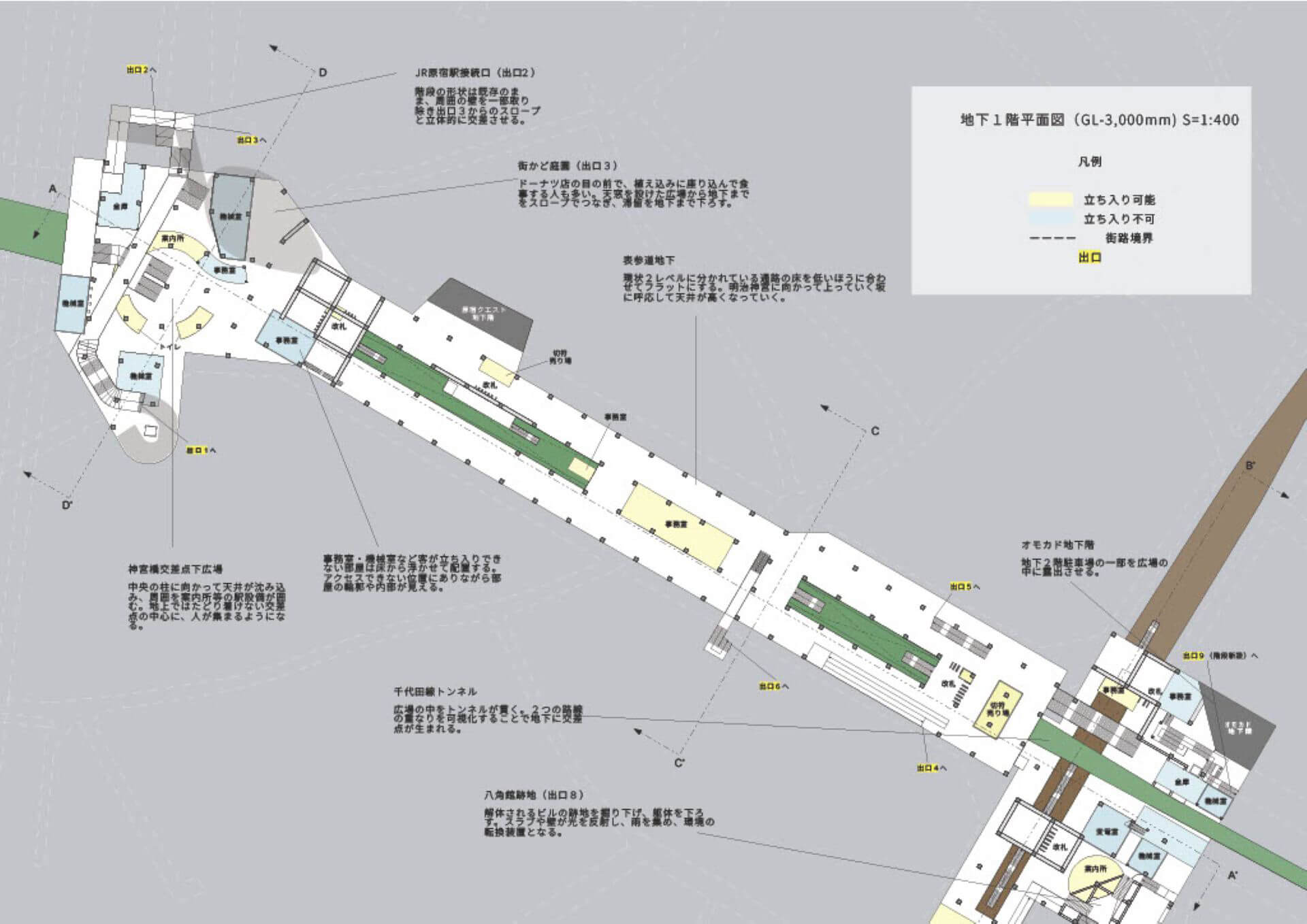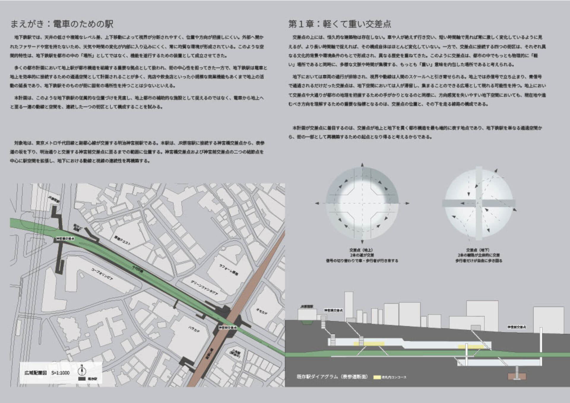 地上に従属してきた地下鉄駅を交差点の下に一つの街区として位置づけ、これまで通過点でしかなかった空間を、街の流れが交わり滞在する場として再構成する。