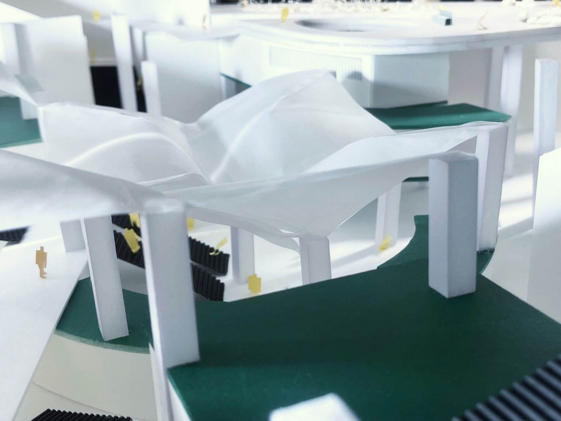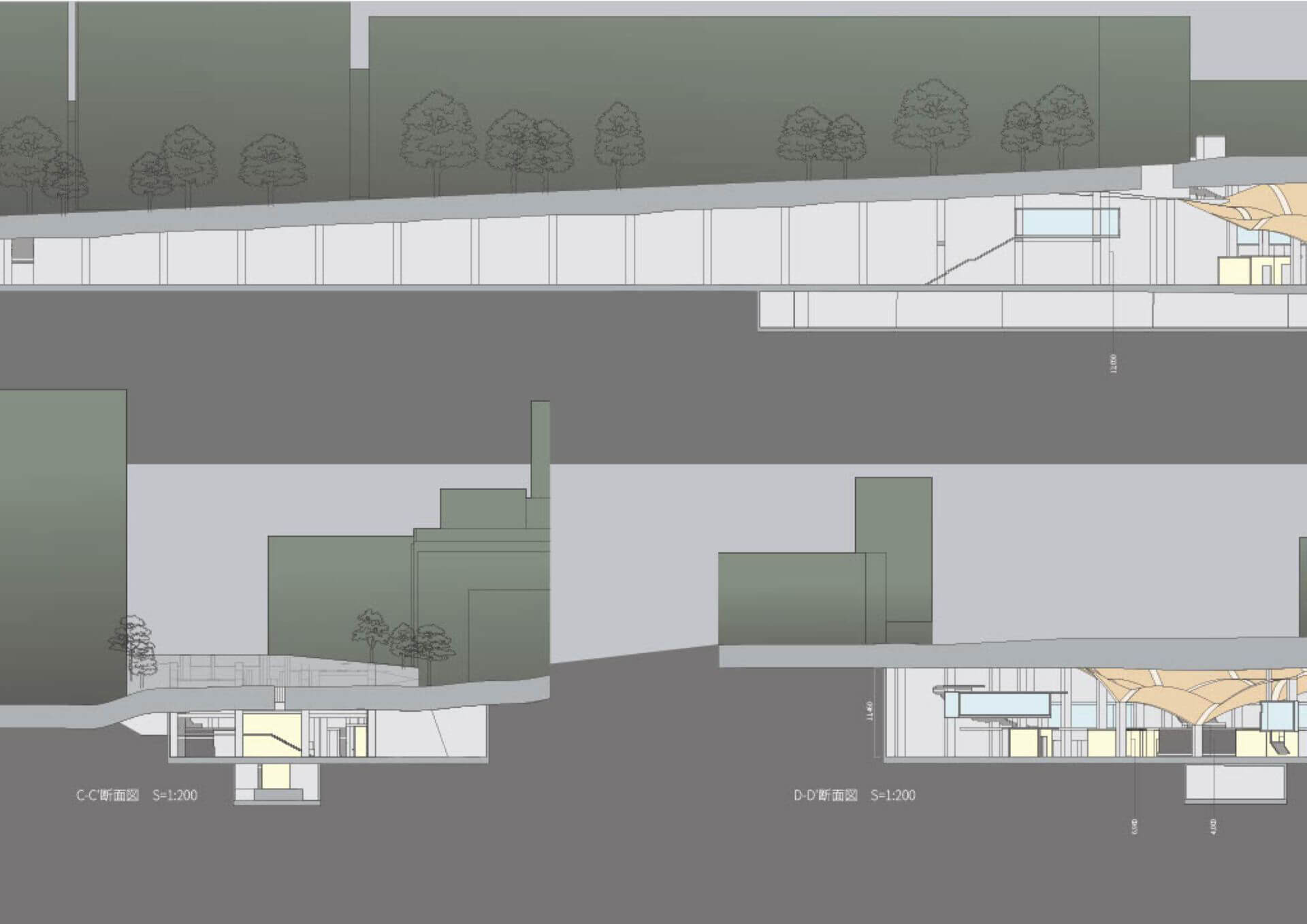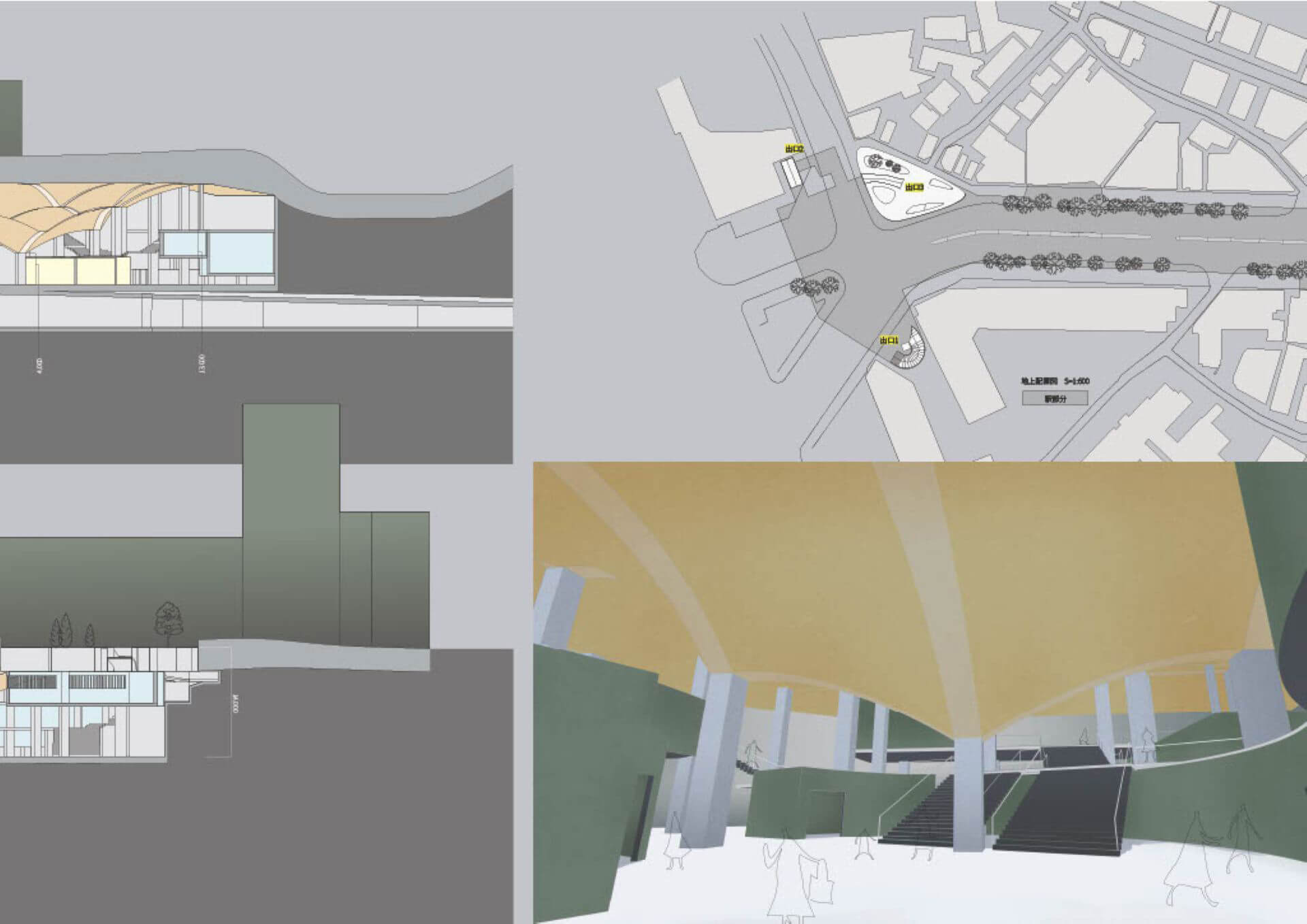地上に従属してきた地下鉄駅を交差点の下に一つの街区として位置づけ、これまで通過点でしかなかった空間を、街の流れが交わり滞在する場として再構成する。