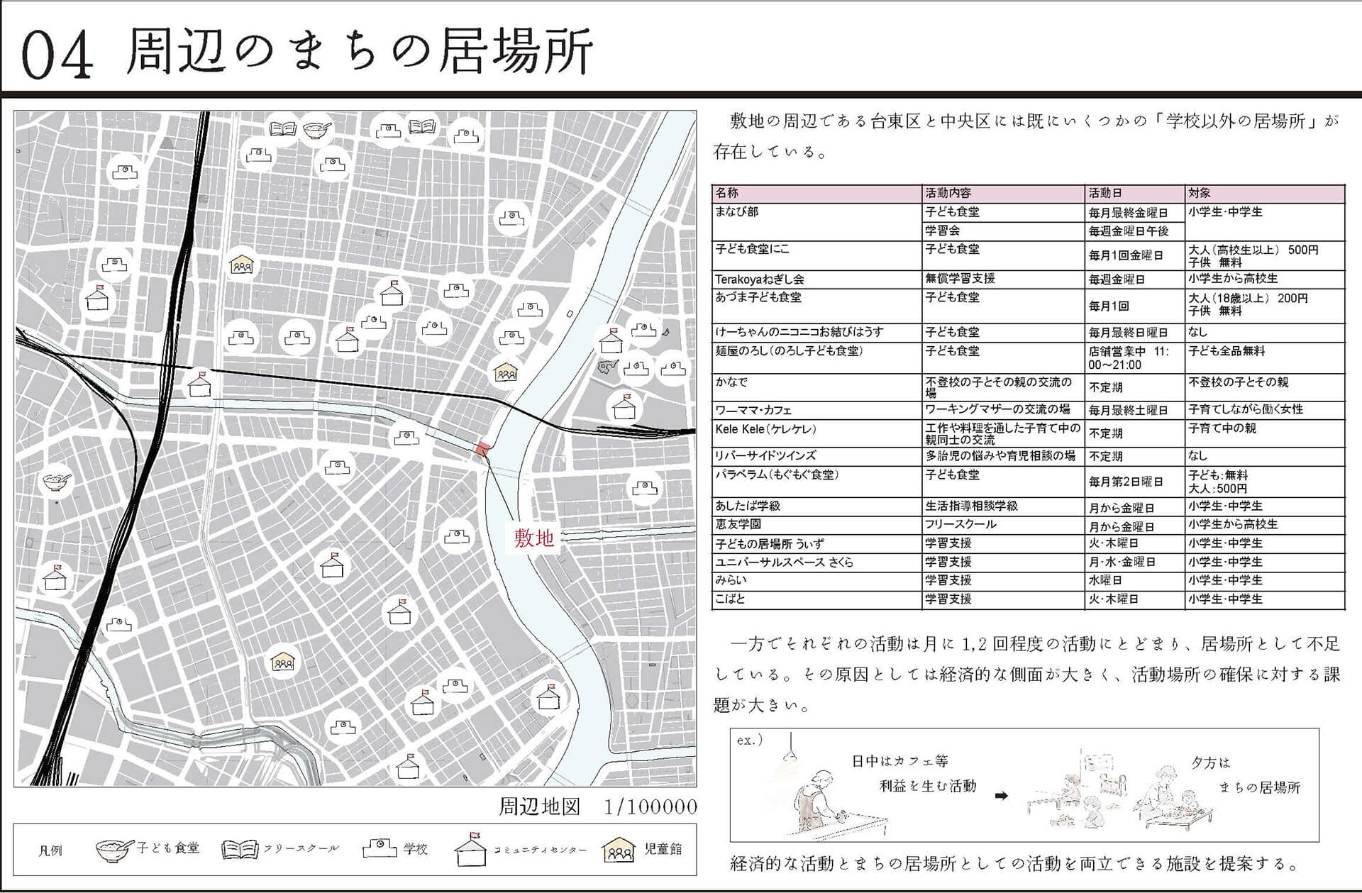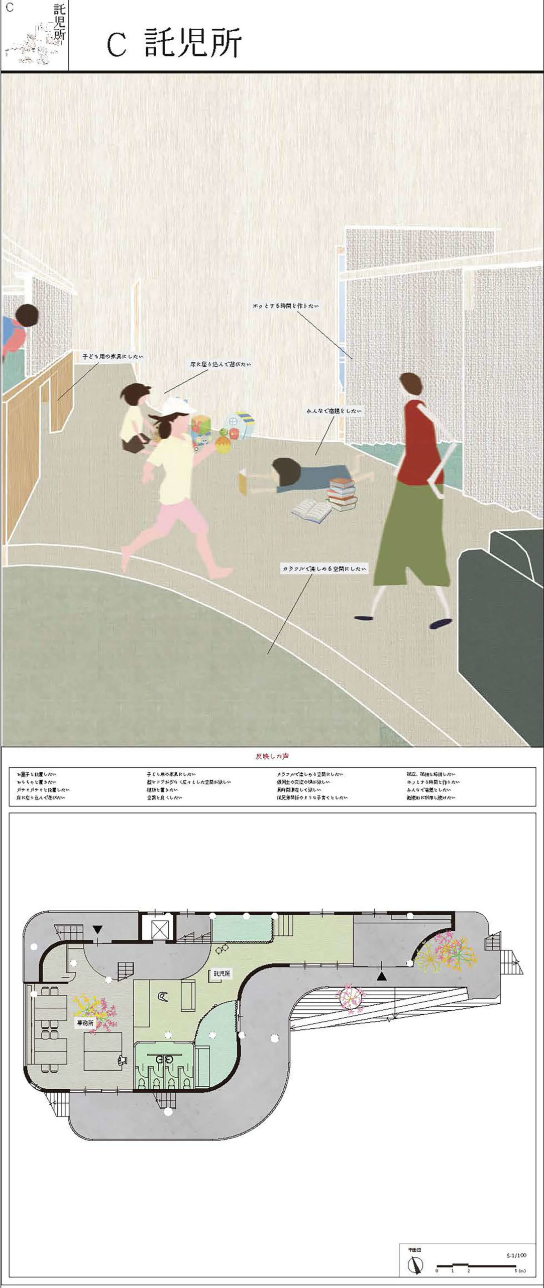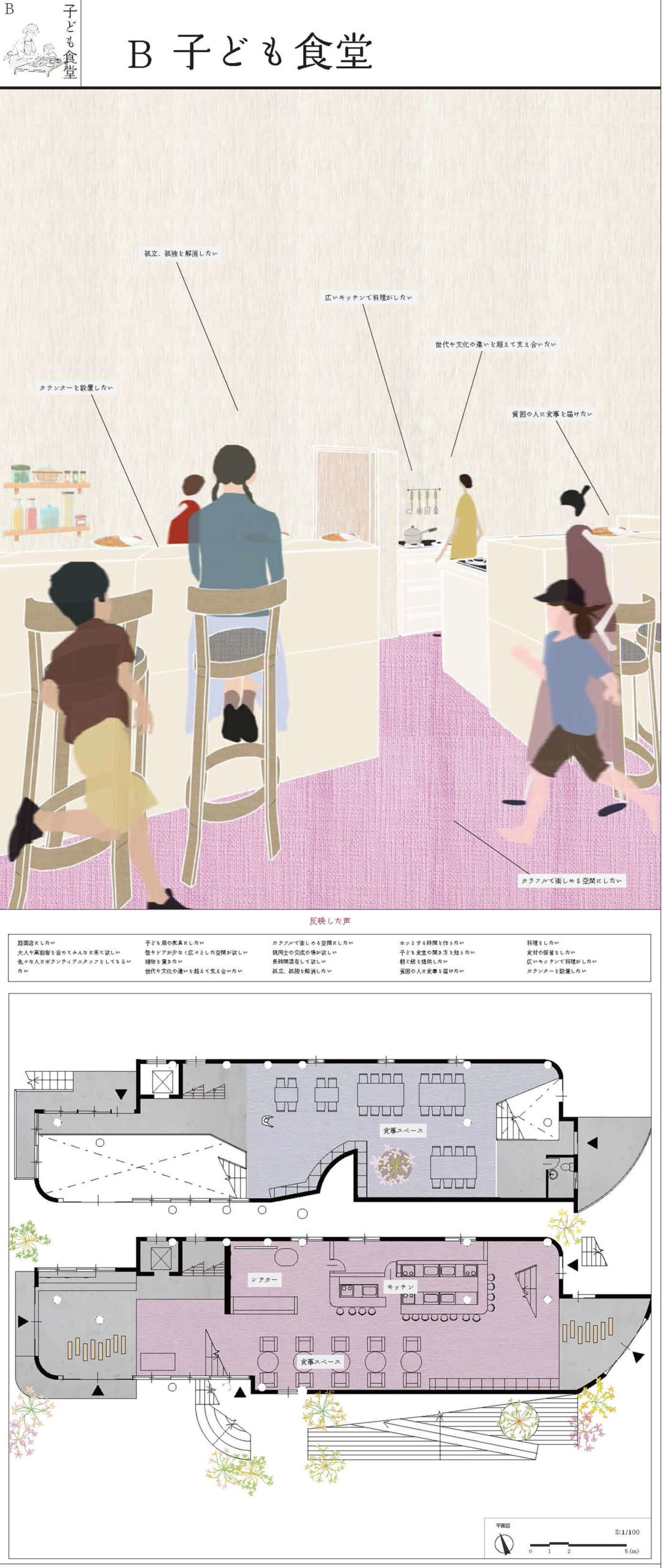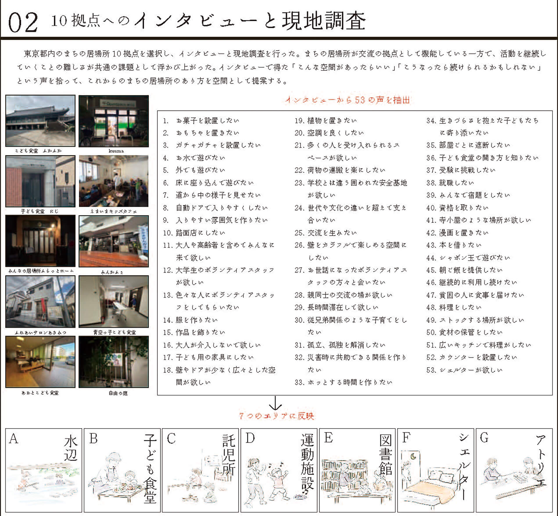 10拠点の子どものための「まちの居場所」へインタビューを行い、得られた声から新たなコミュニティ施設を提案した。