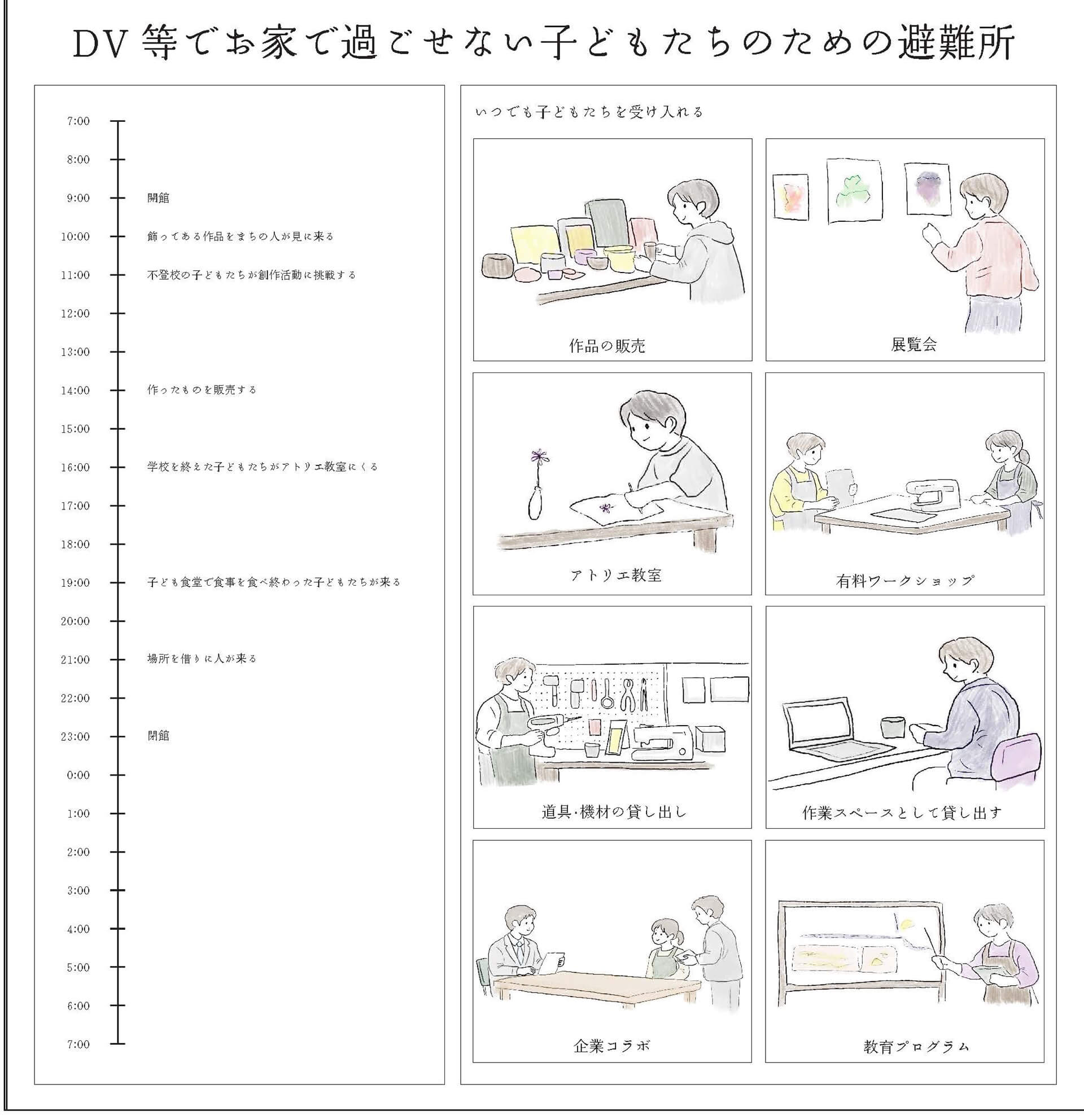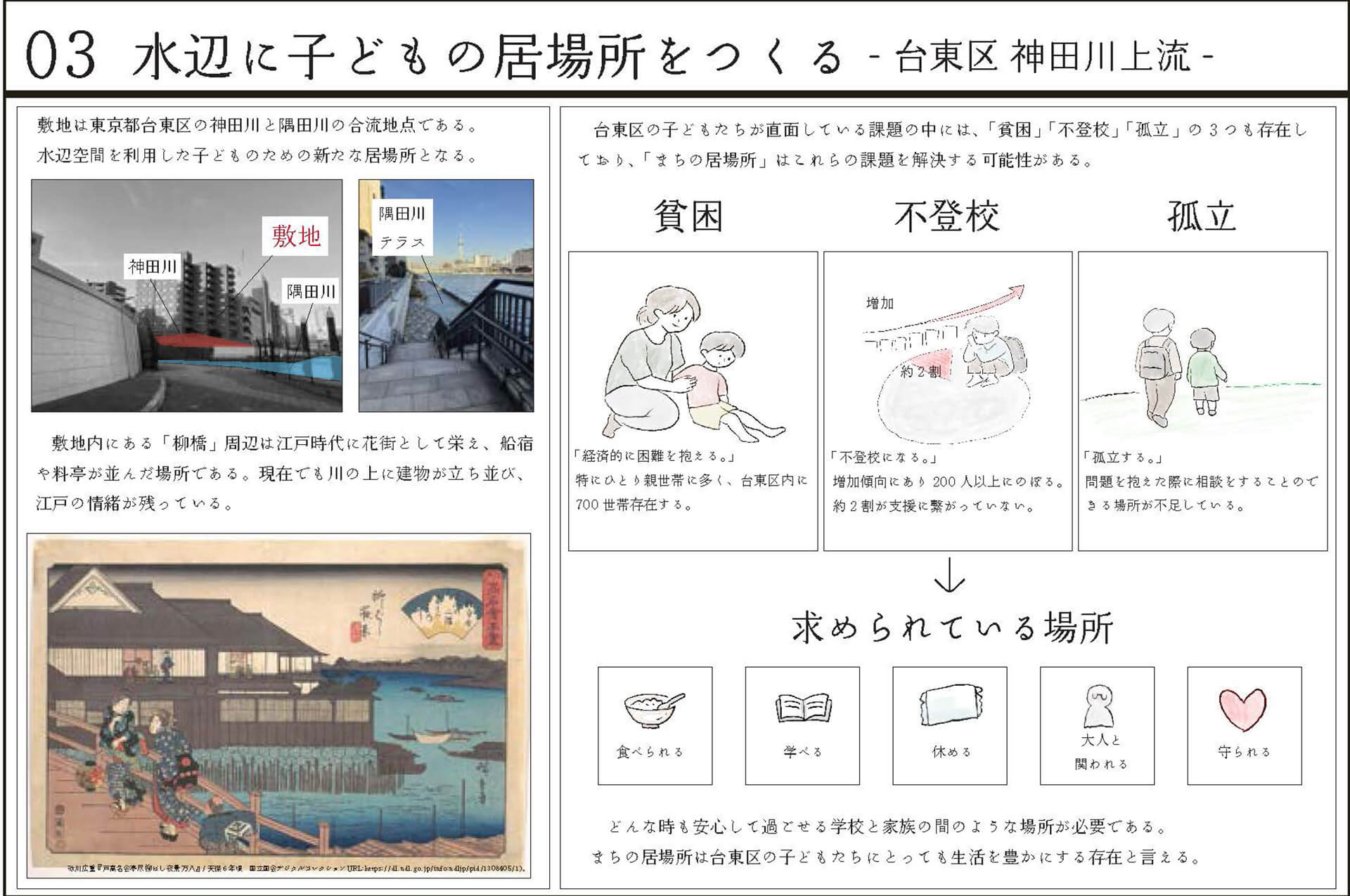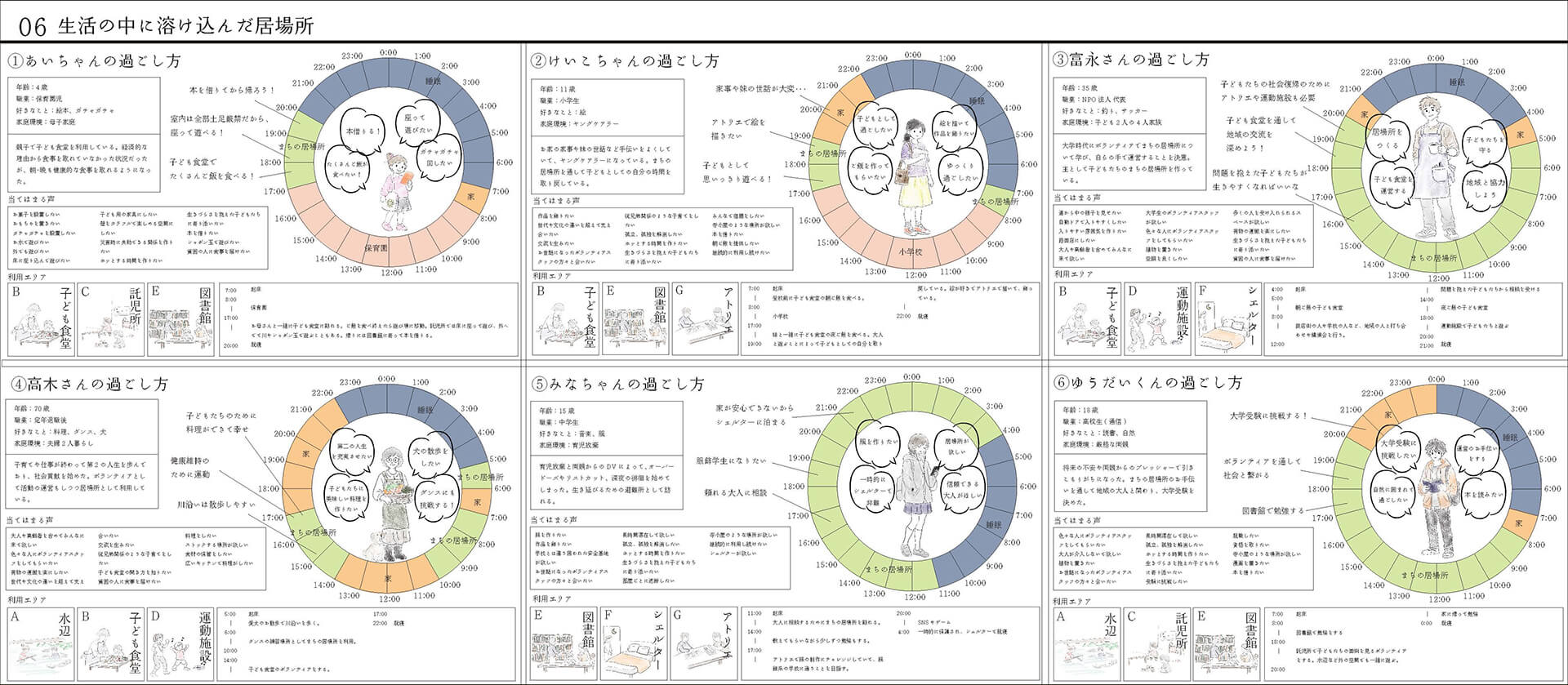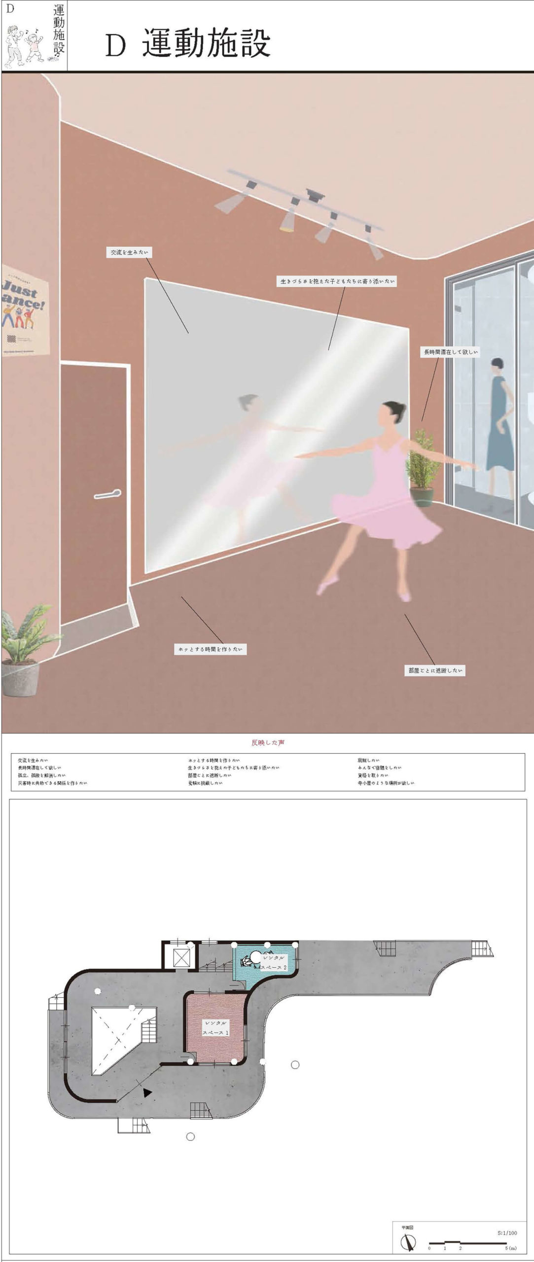 10拠点の子どものための「まちの居場所」へインタビューを行い、得られた声から新たなコミュニティ施設を提案した。