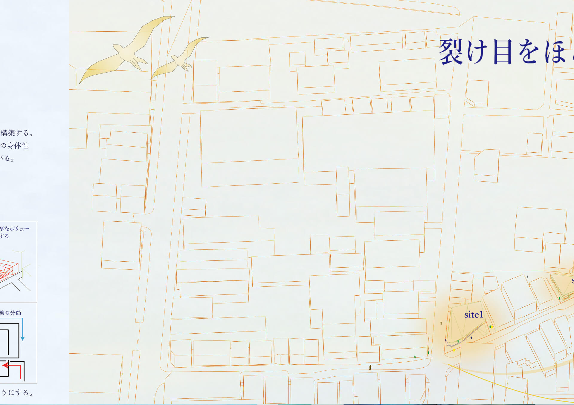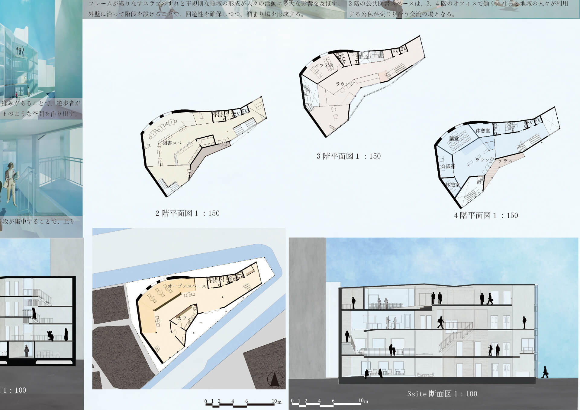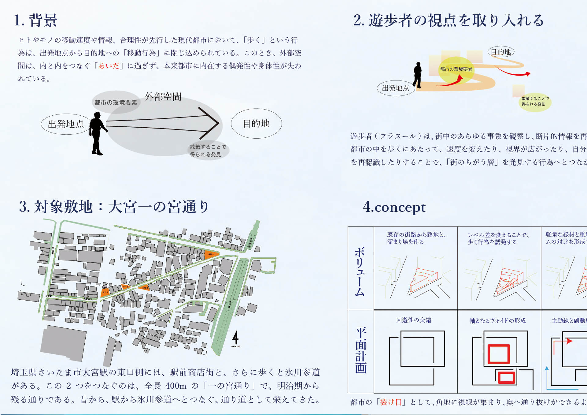 情報の高速化、複雑化のもと、「歩く」という行為は、単なる移動行為に閉じ込められている。外部空間は、この時通過のためだけの「あいだ」となっており、遊歩者的視点で構成された建築で、「街の違う層」を見つける。