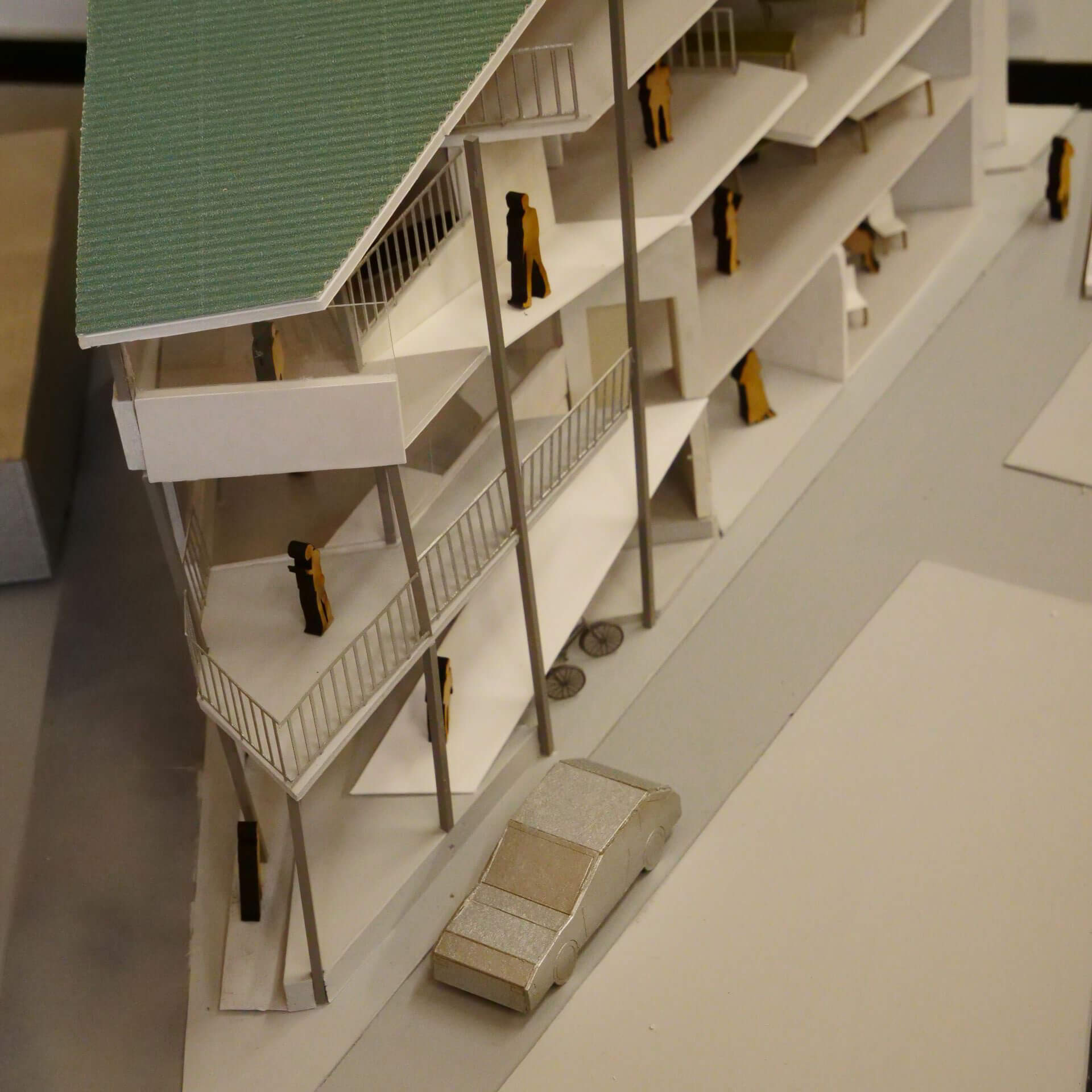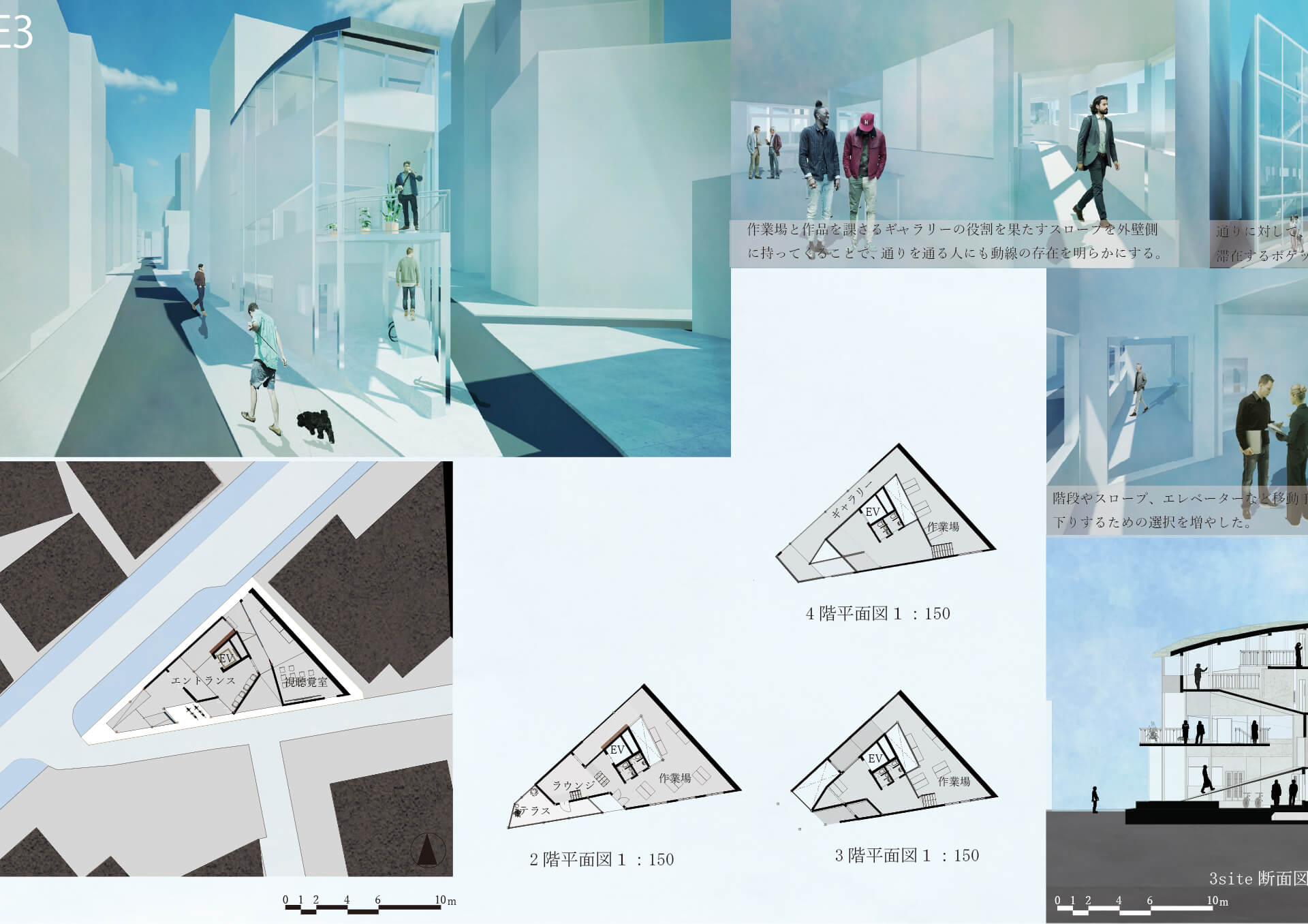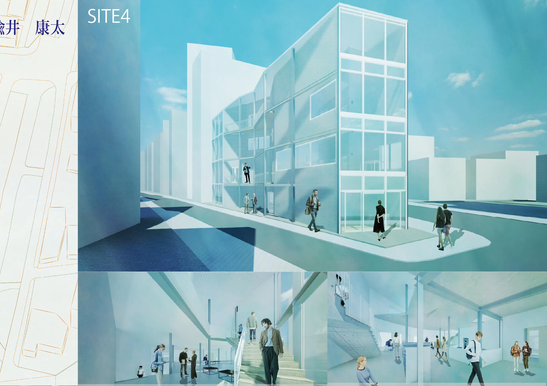 情報の高速化、複雑化のもと、「歩く」という行為は、単なる移動行為に閉じ込められている。外部空間は、この時通過のためだけの「あいだ」となっており、遊歩者的視点で構成された建築で、「街の違う層」を見つける。