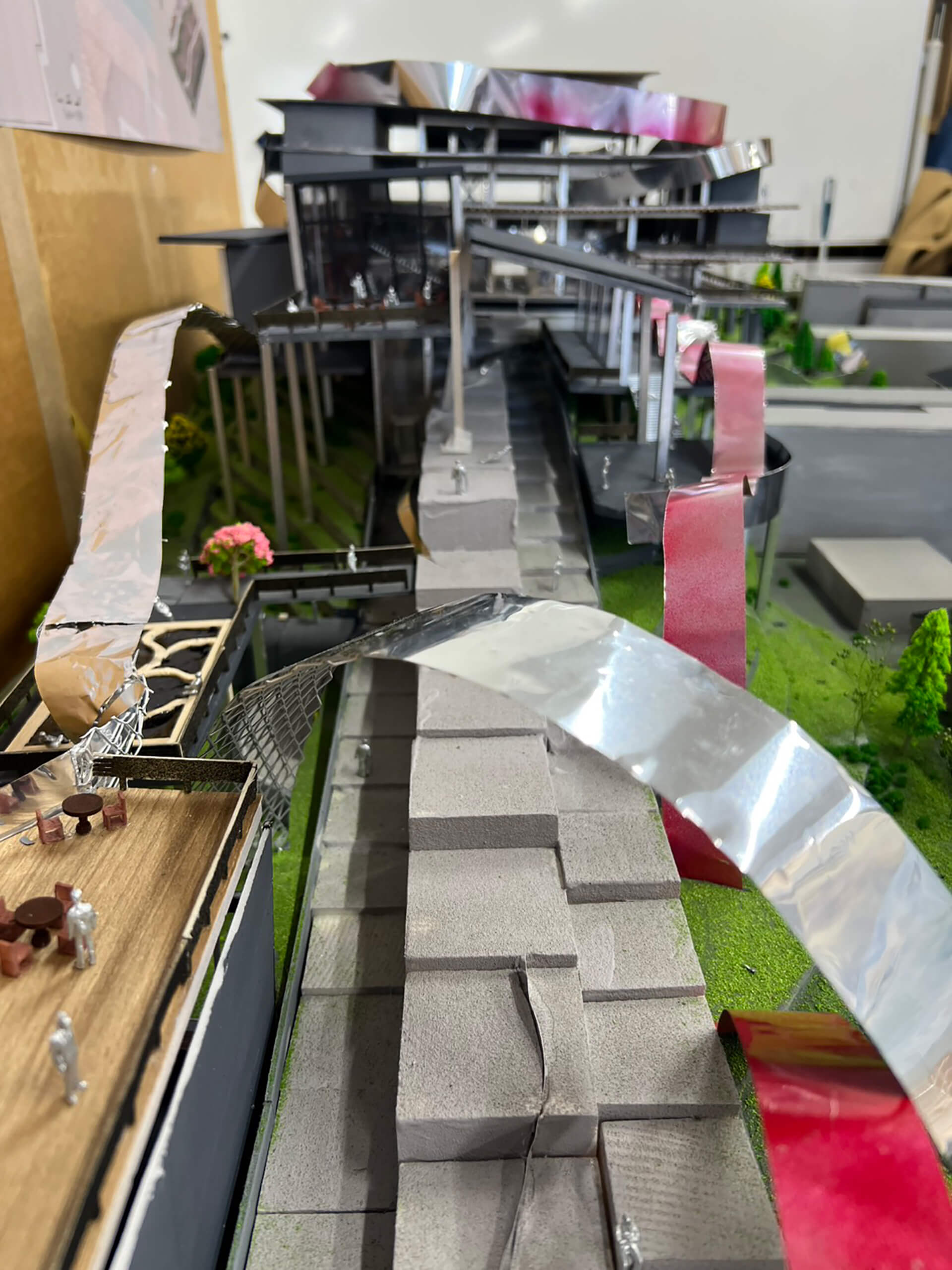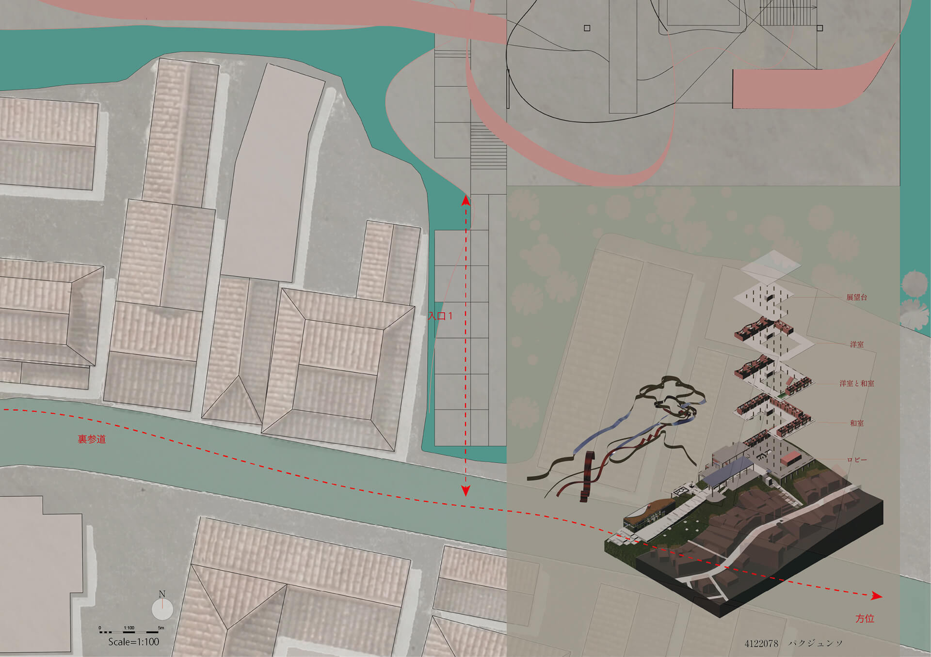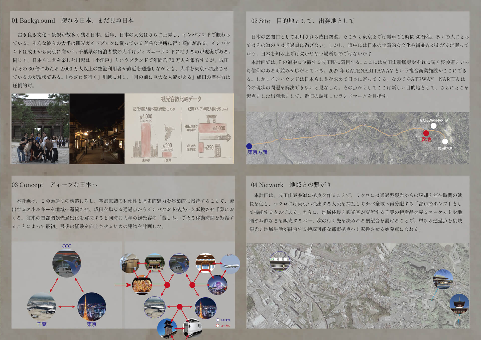この建築は、成田に流れる二つの時間、成田山の静寂な過去と空港の活気ある未来を帯で結び、一つのcorridorで緩やかにつなぐ「都市の時計」である。