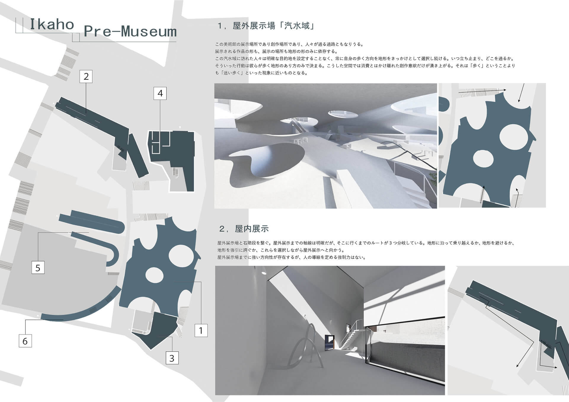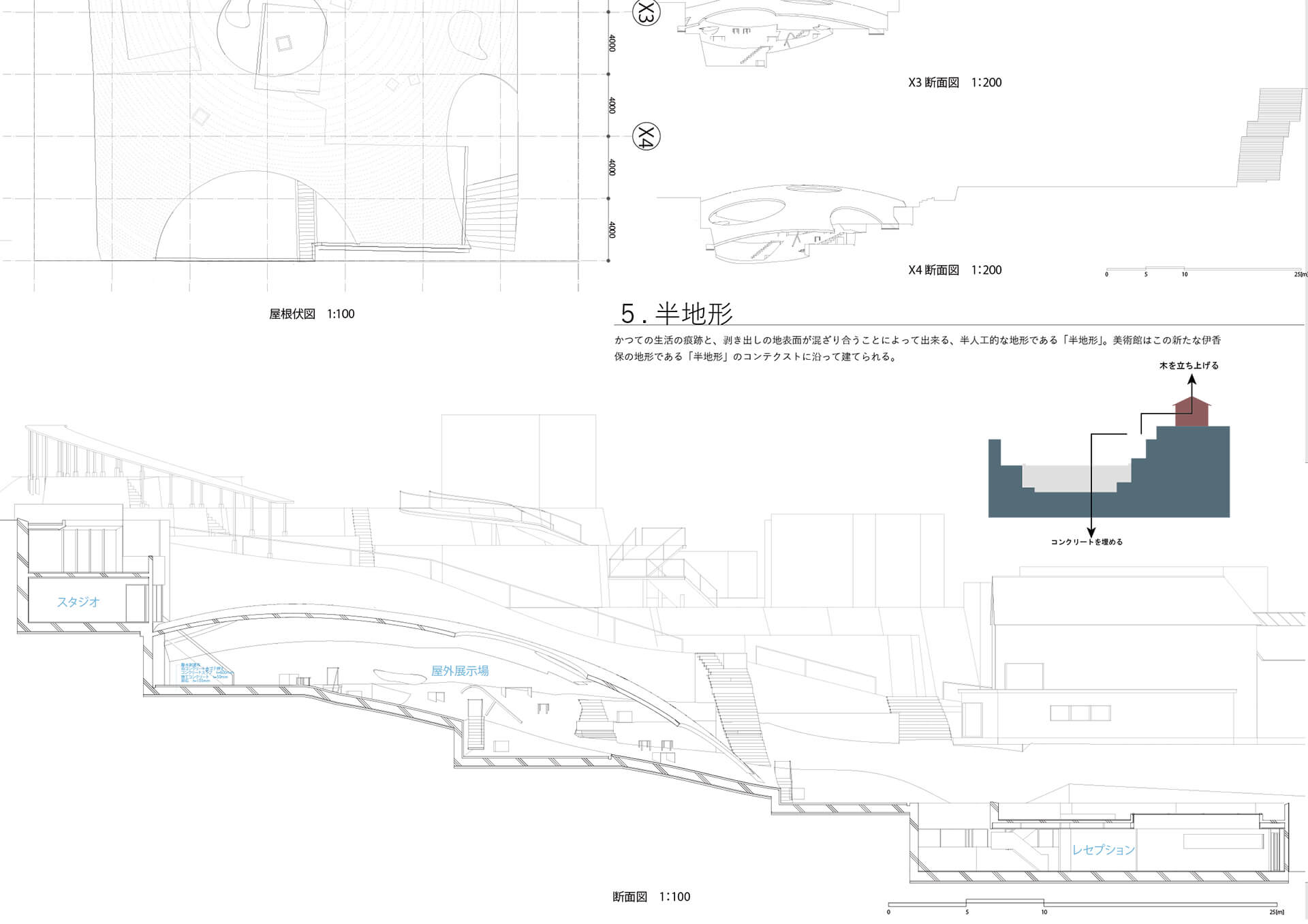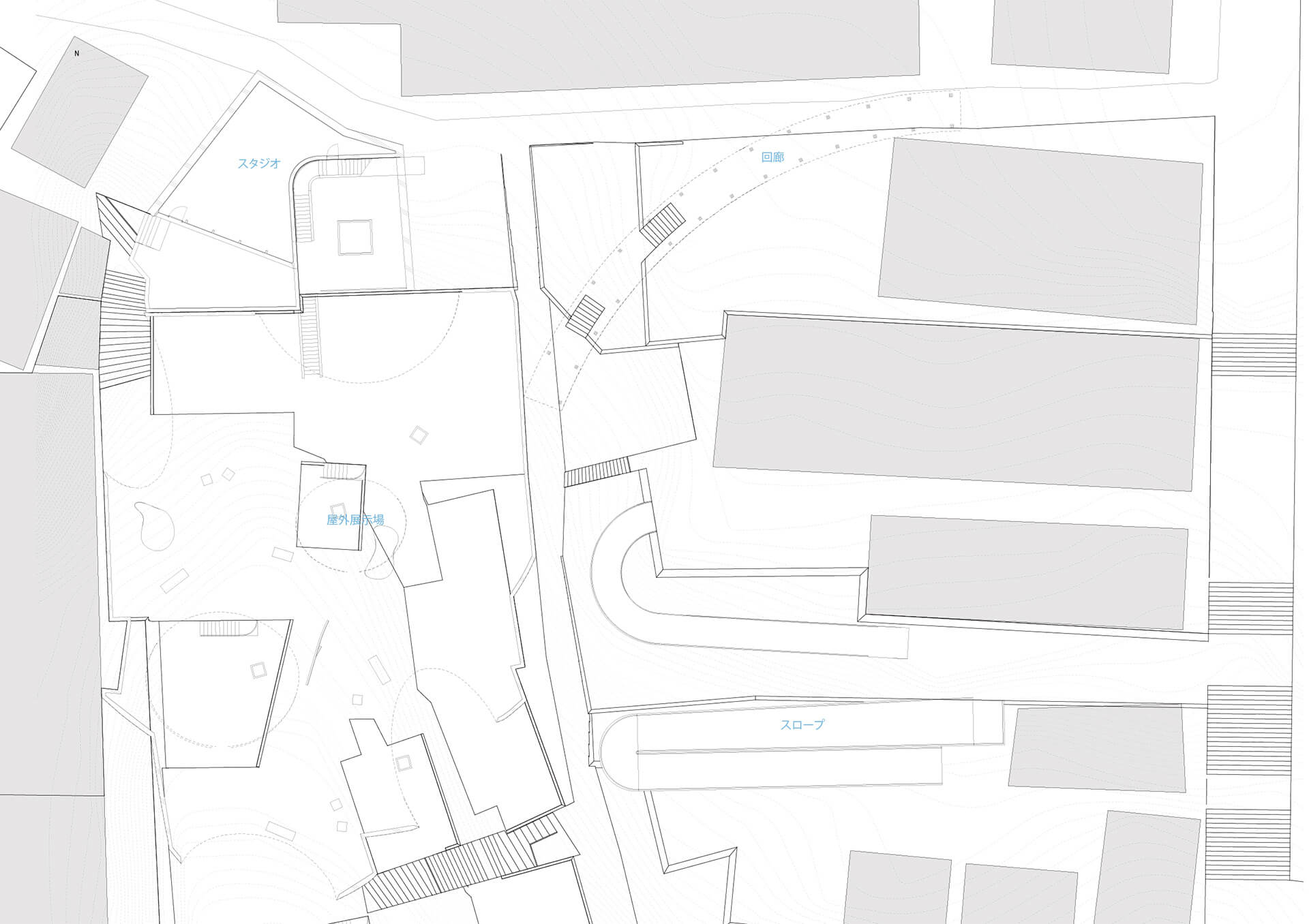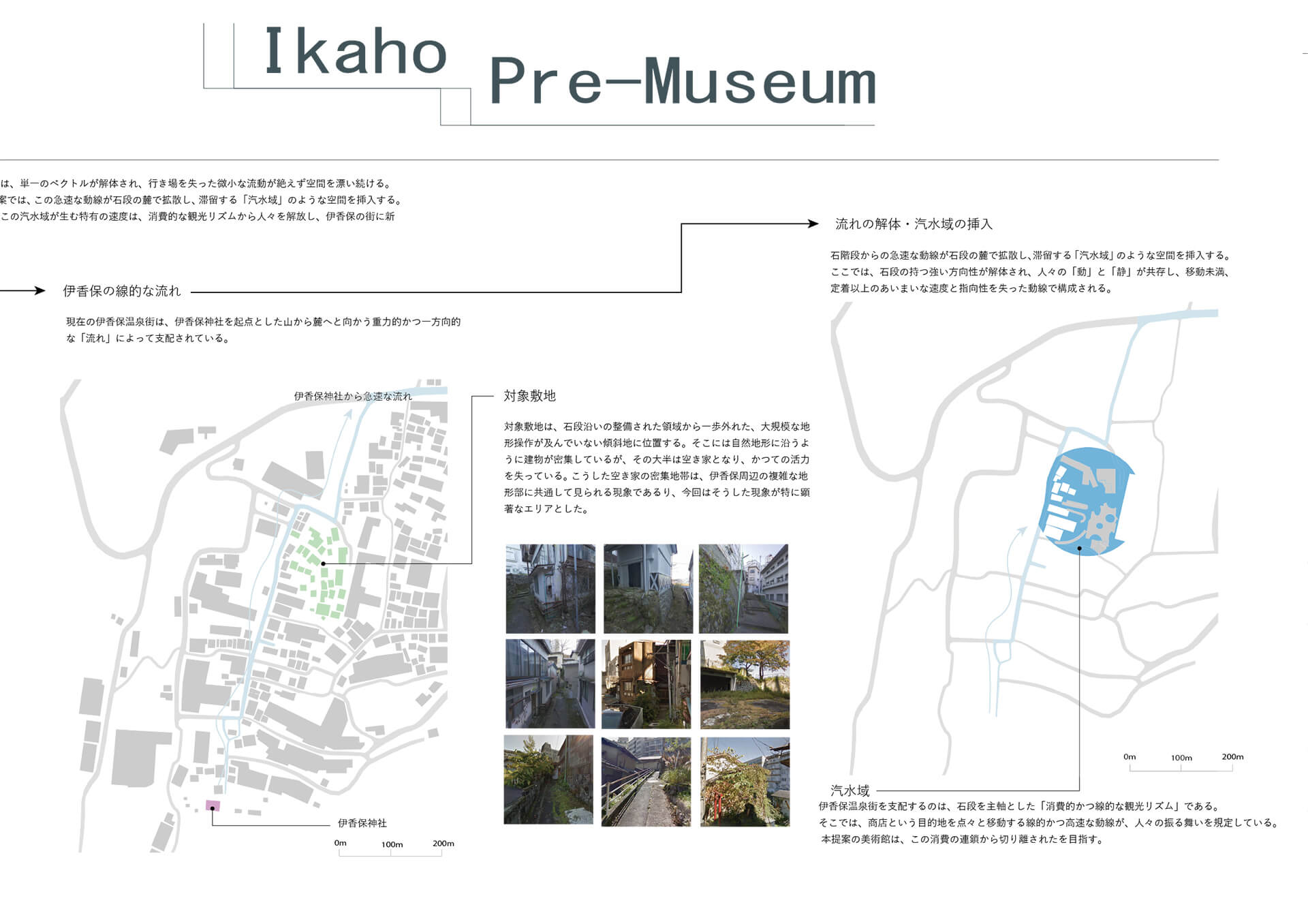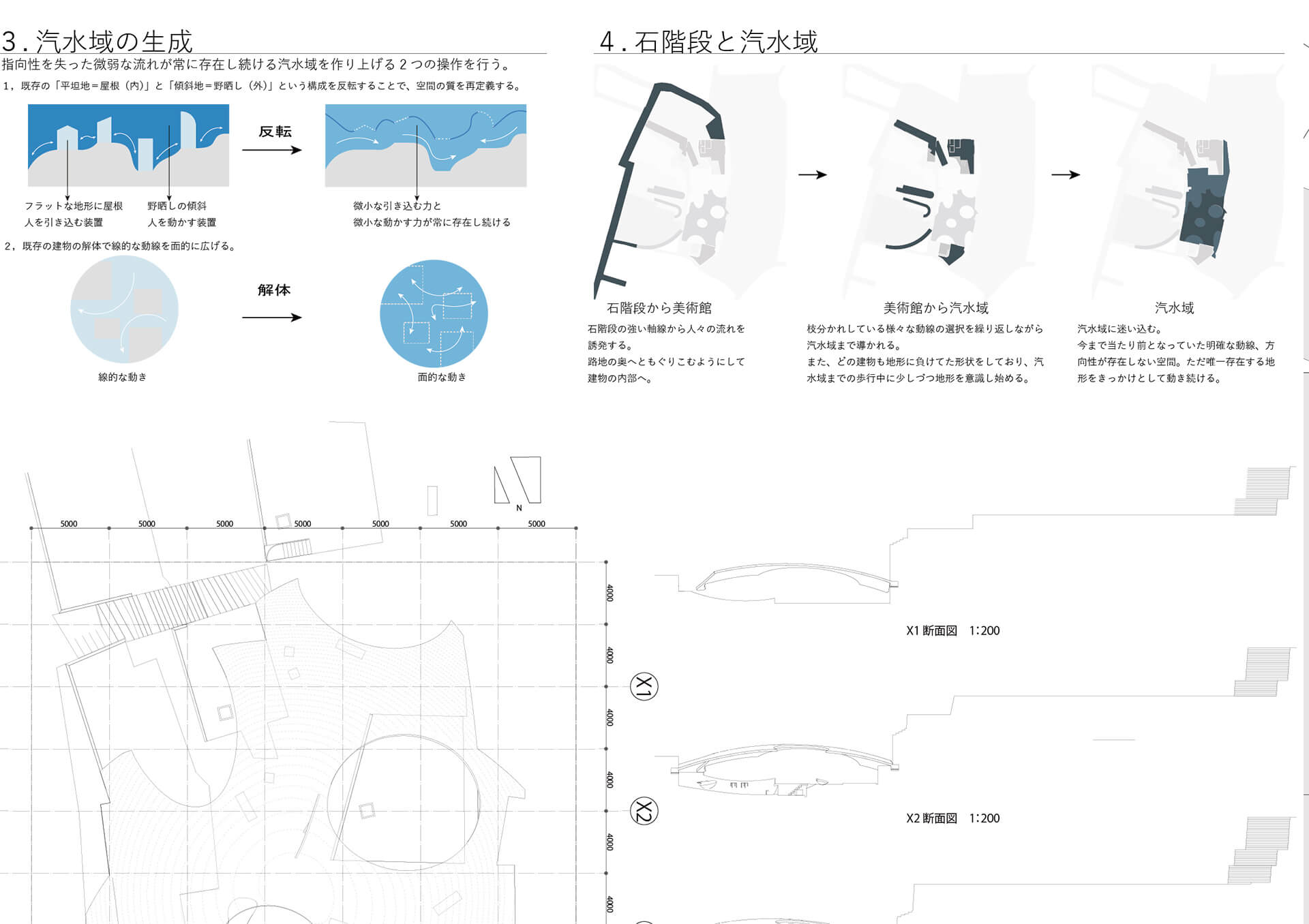 伊香保温泉街を支配するのは、石段を主軸とした「消費的かつ線的な観光リズム」である。そこでは、商店という目的地を点々と移動する線的かつ高速な動線が、人々の振る舞いを規定している。本提案の美術館は、この消費の連鎖から切り離されたを目指す。