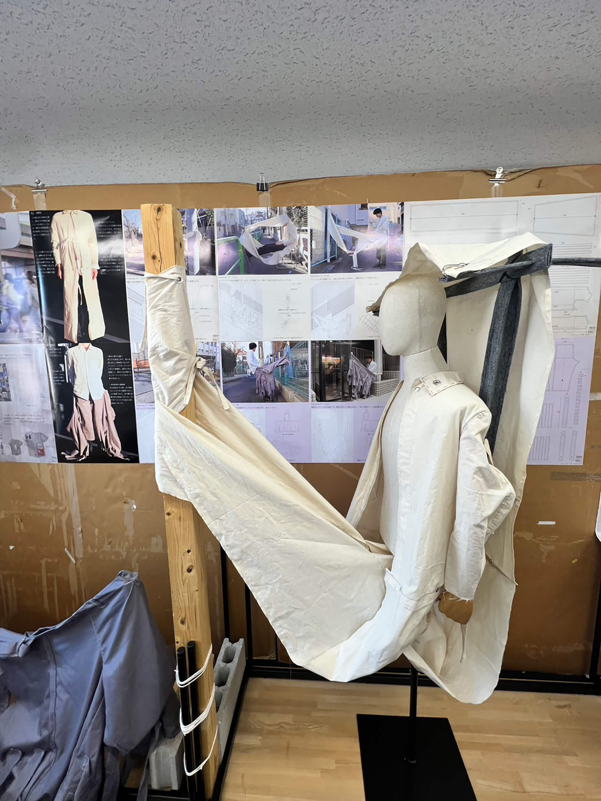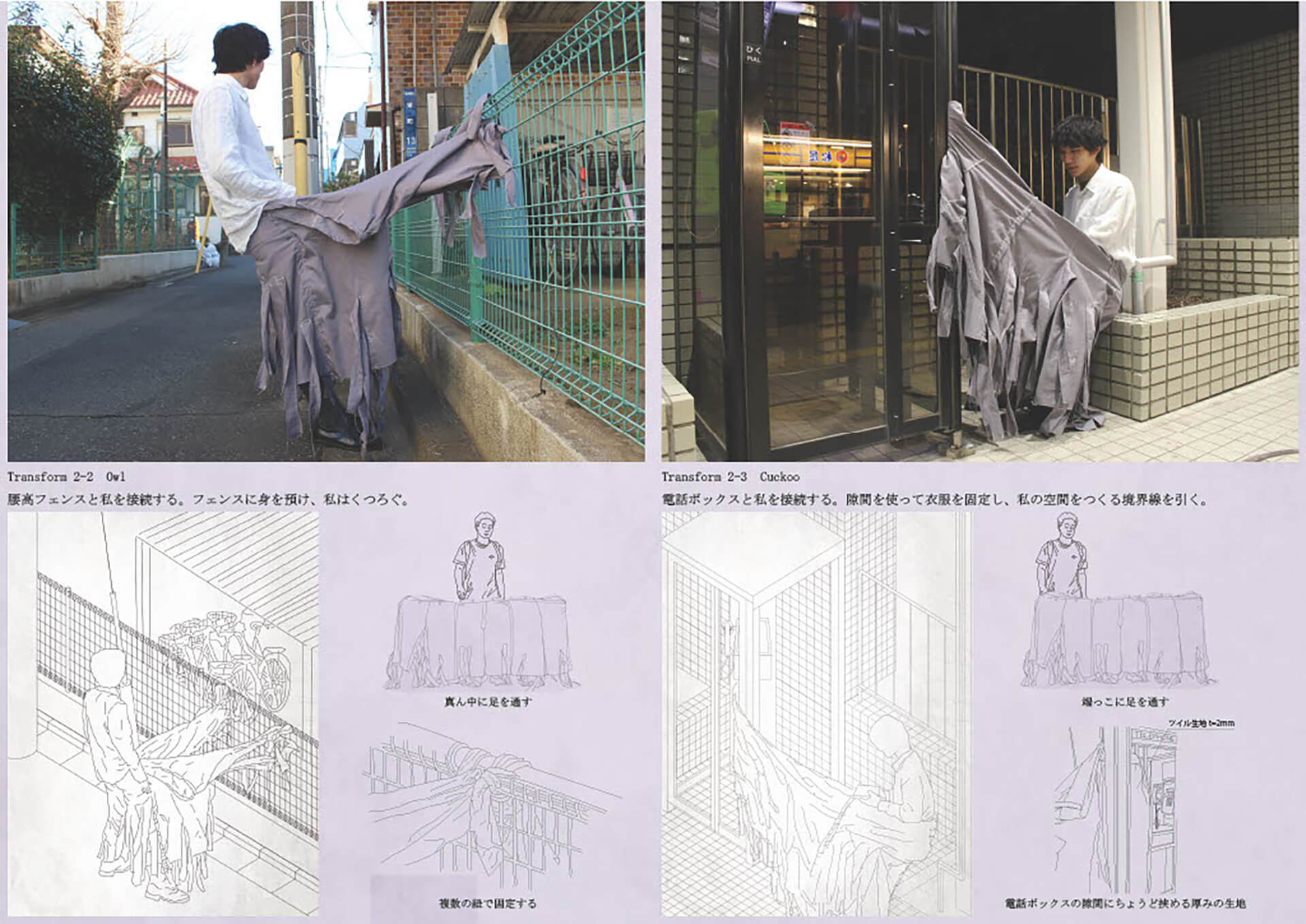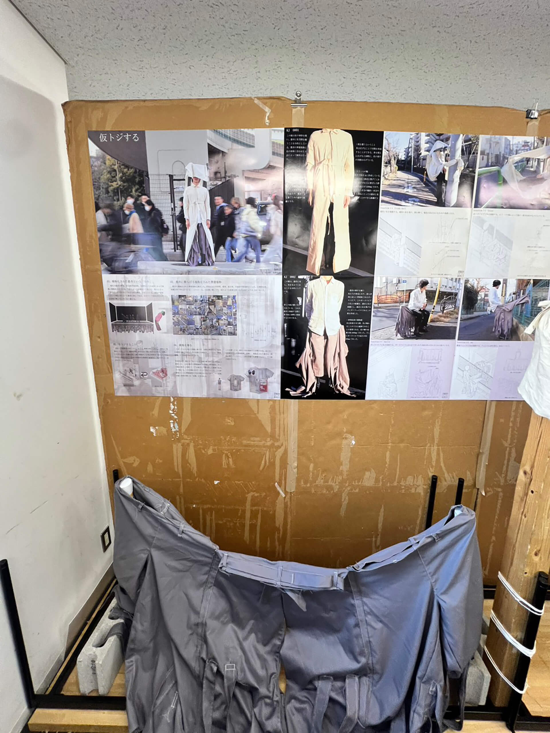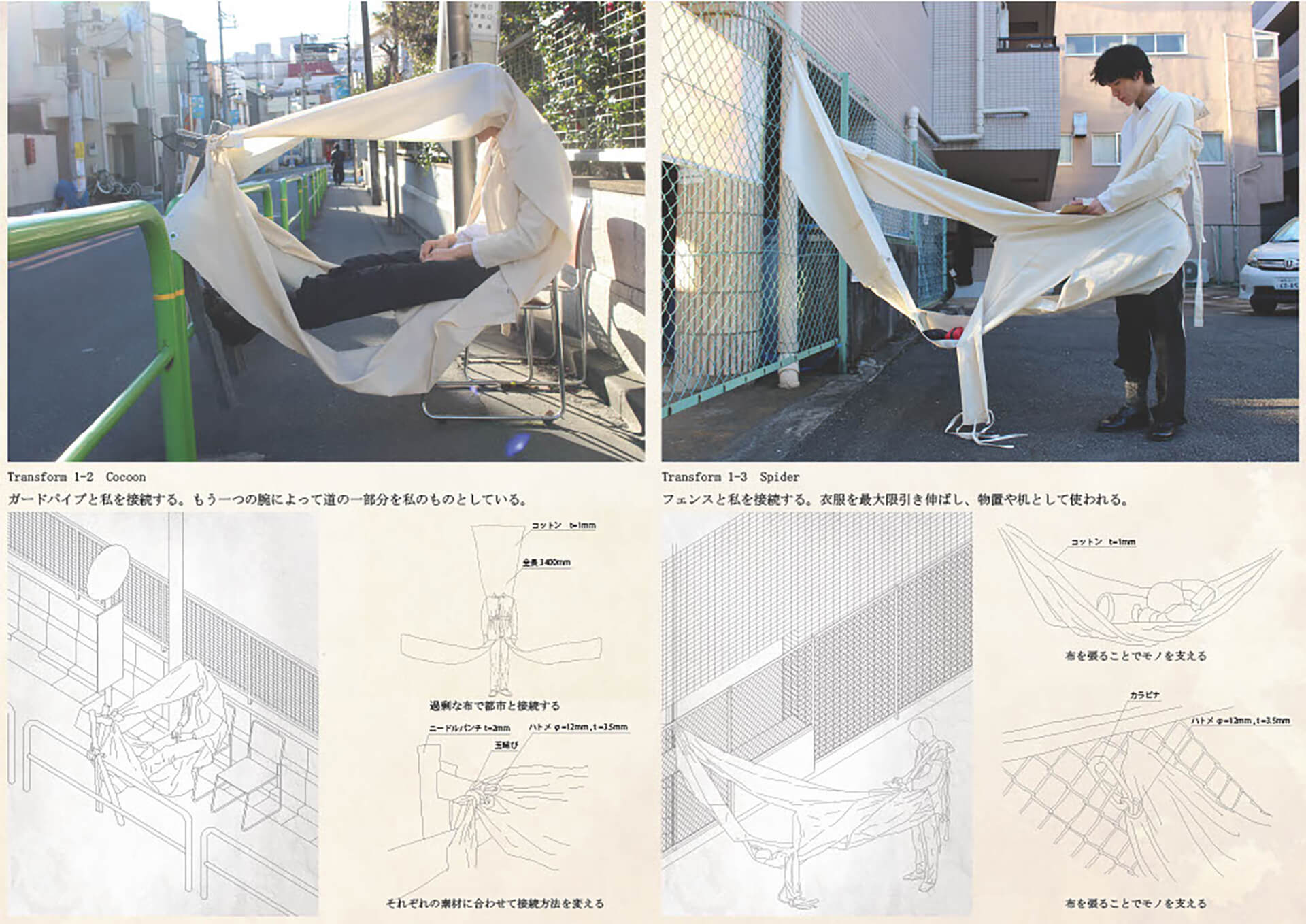 都市は規格に溢れている。それらの寸法と形態を内包した衣服は身体との間に余剰を生み、その余剰を介して私は、規格化された都市を仮トジする。