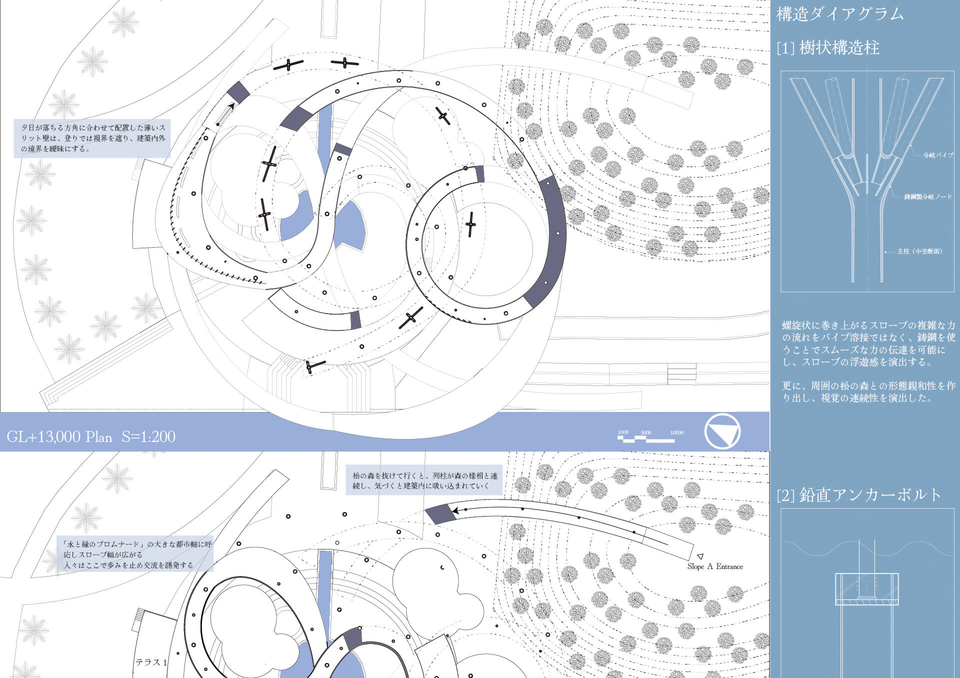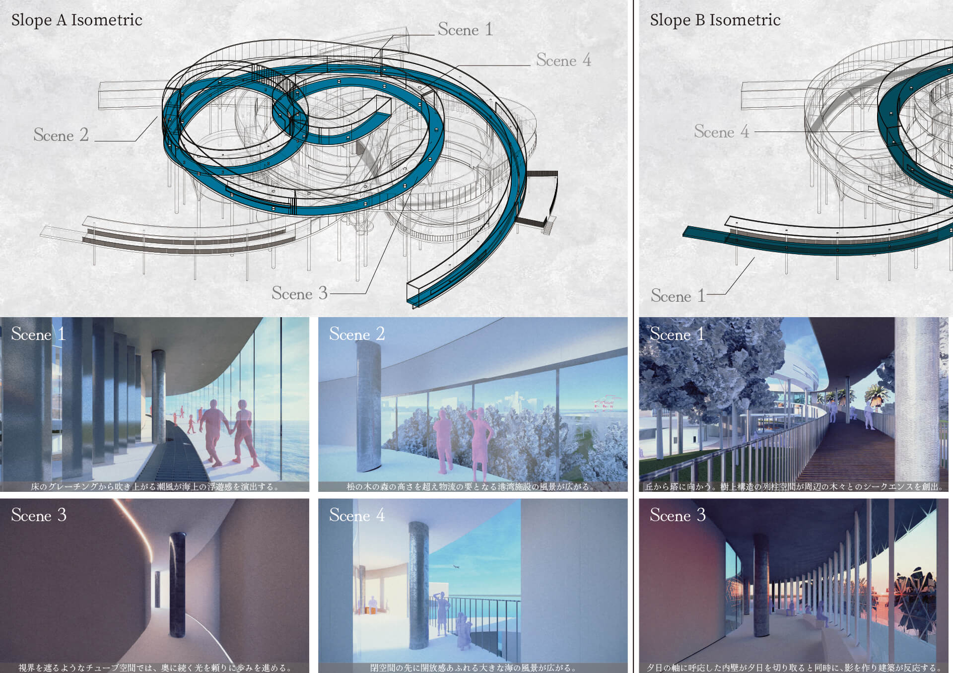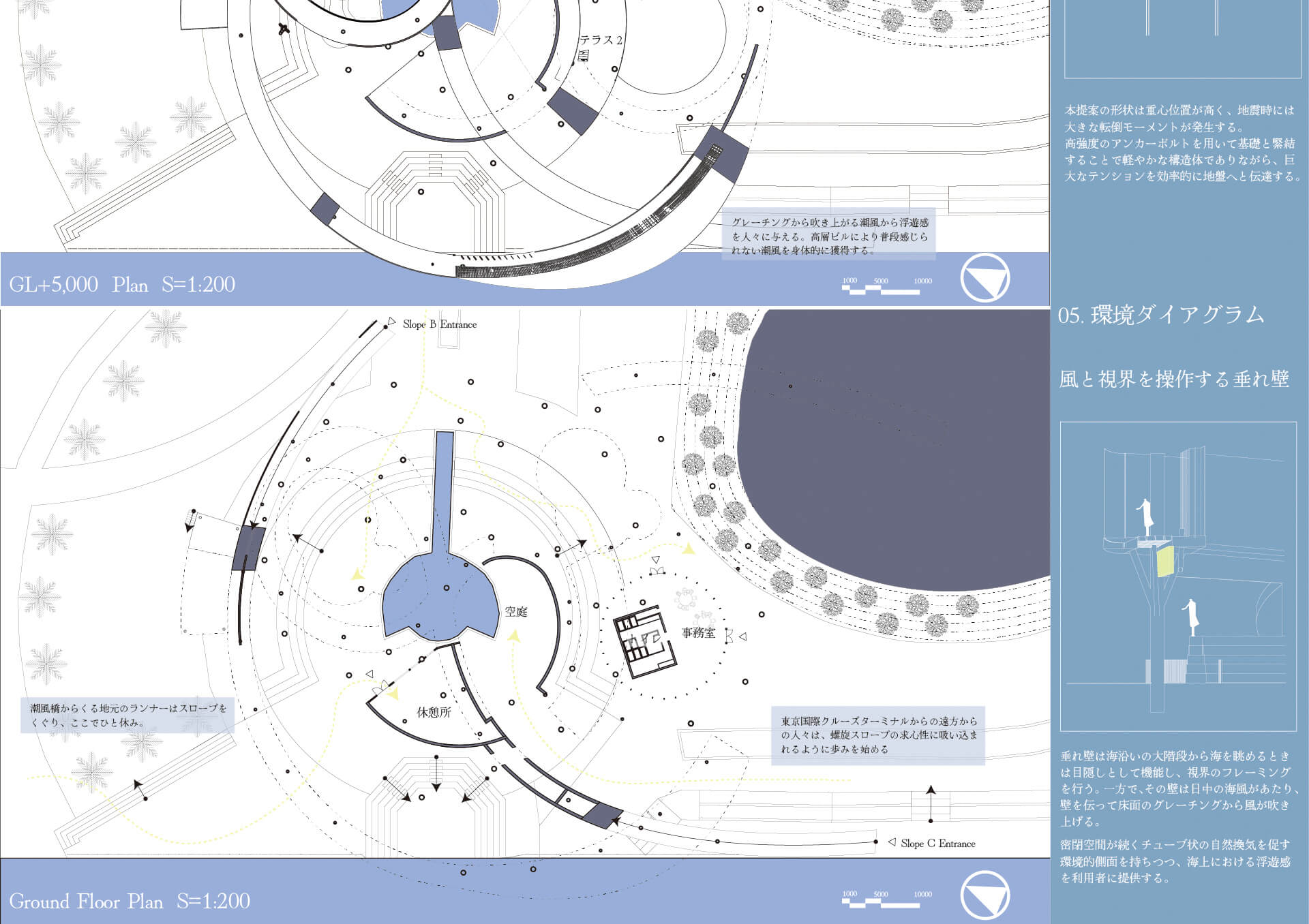 今日、東京は効率と集積の魅力を持つ一方で、効率至上の再開発が曖昧な空間を一掃しつつある。刻々と様相を変えるお台場に身体性に訴えかける恒久的なシンボルを提案する。