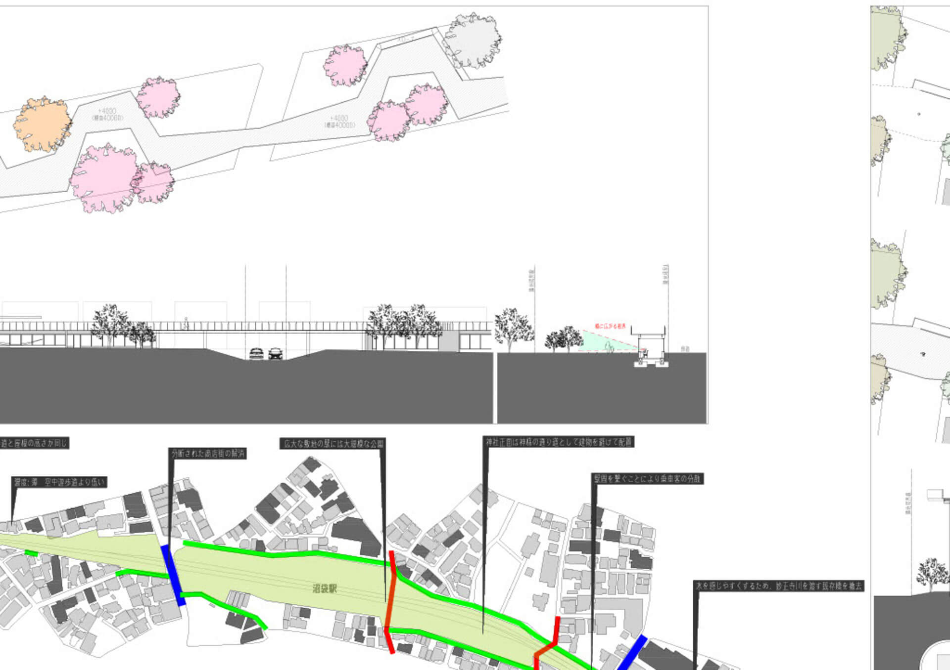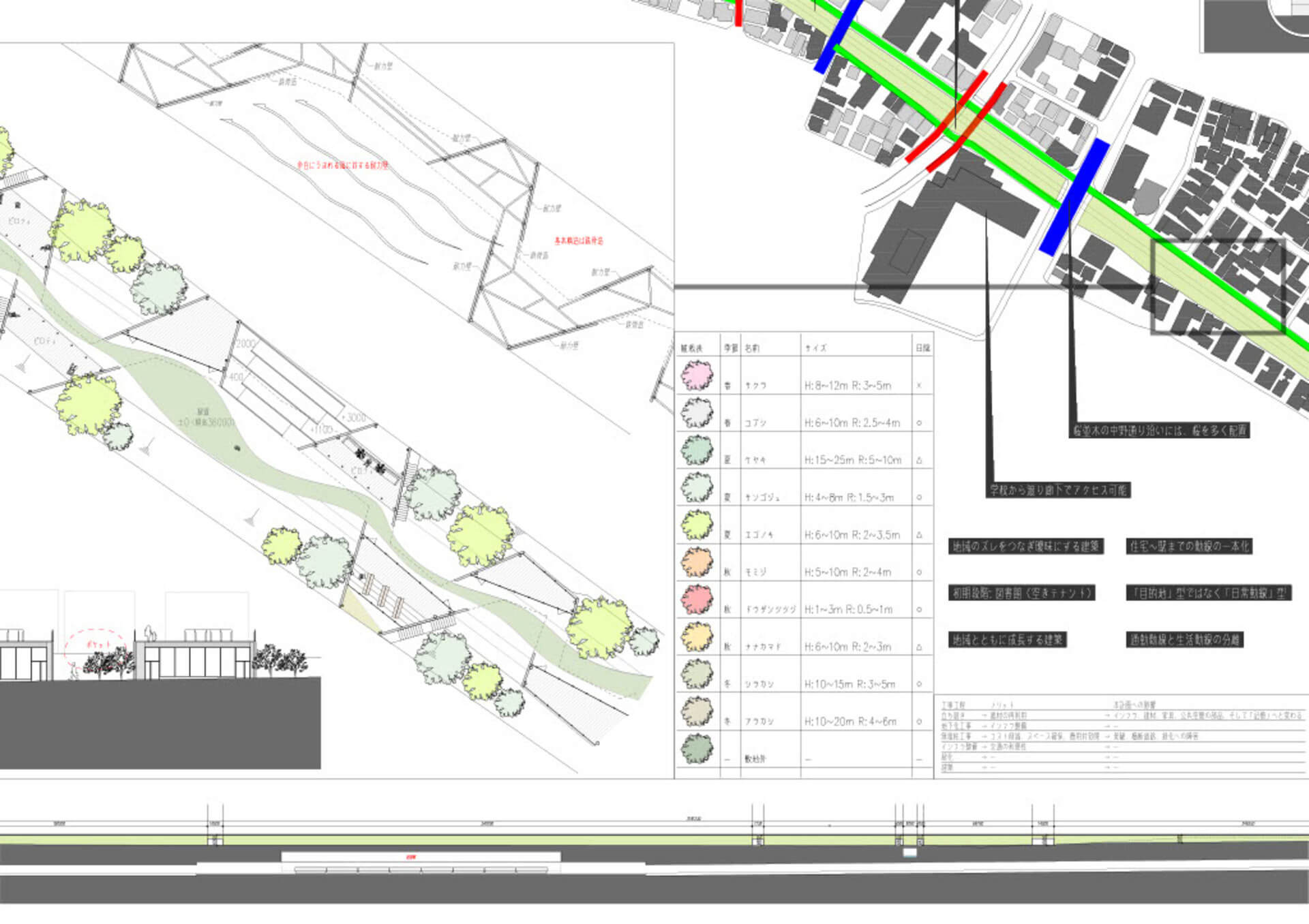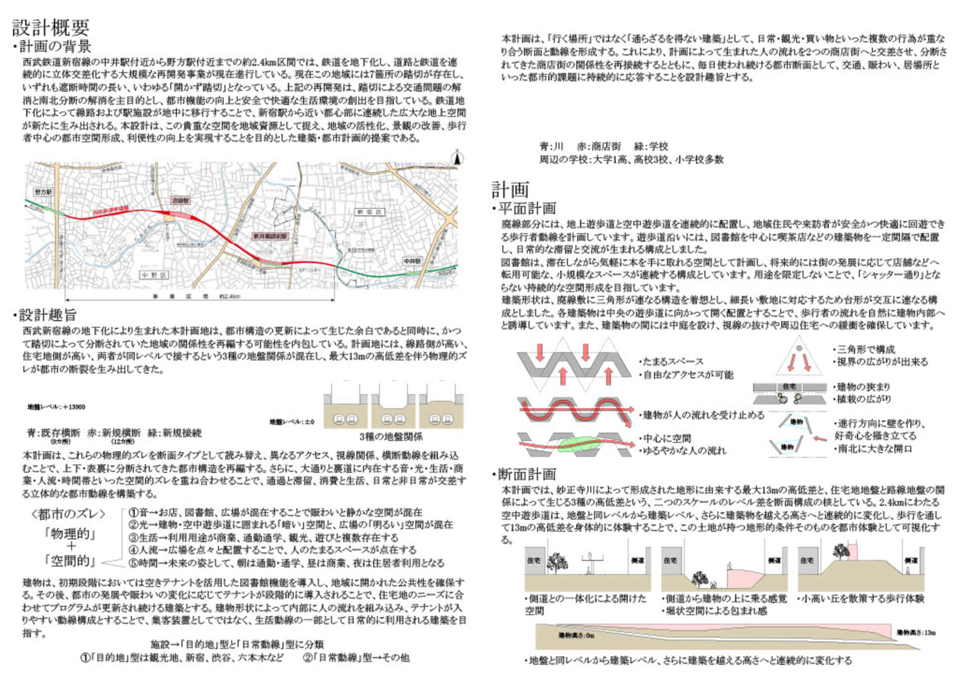西武新宿線立体交差事業により、地上に2.4kmの余白が生まれる。分断されてきた、地域、人、地形、商店街をつなぐための道を提案する。