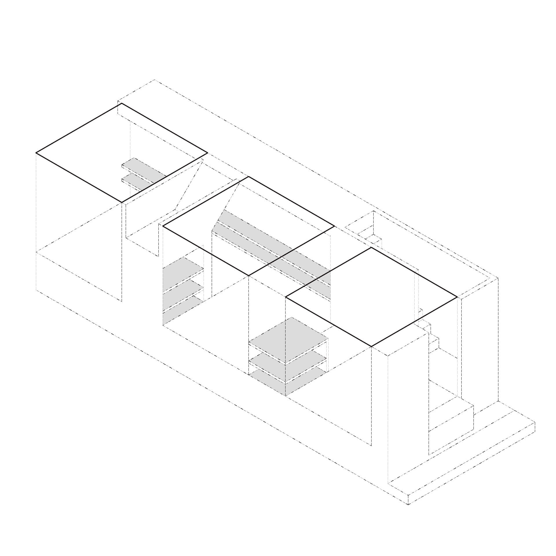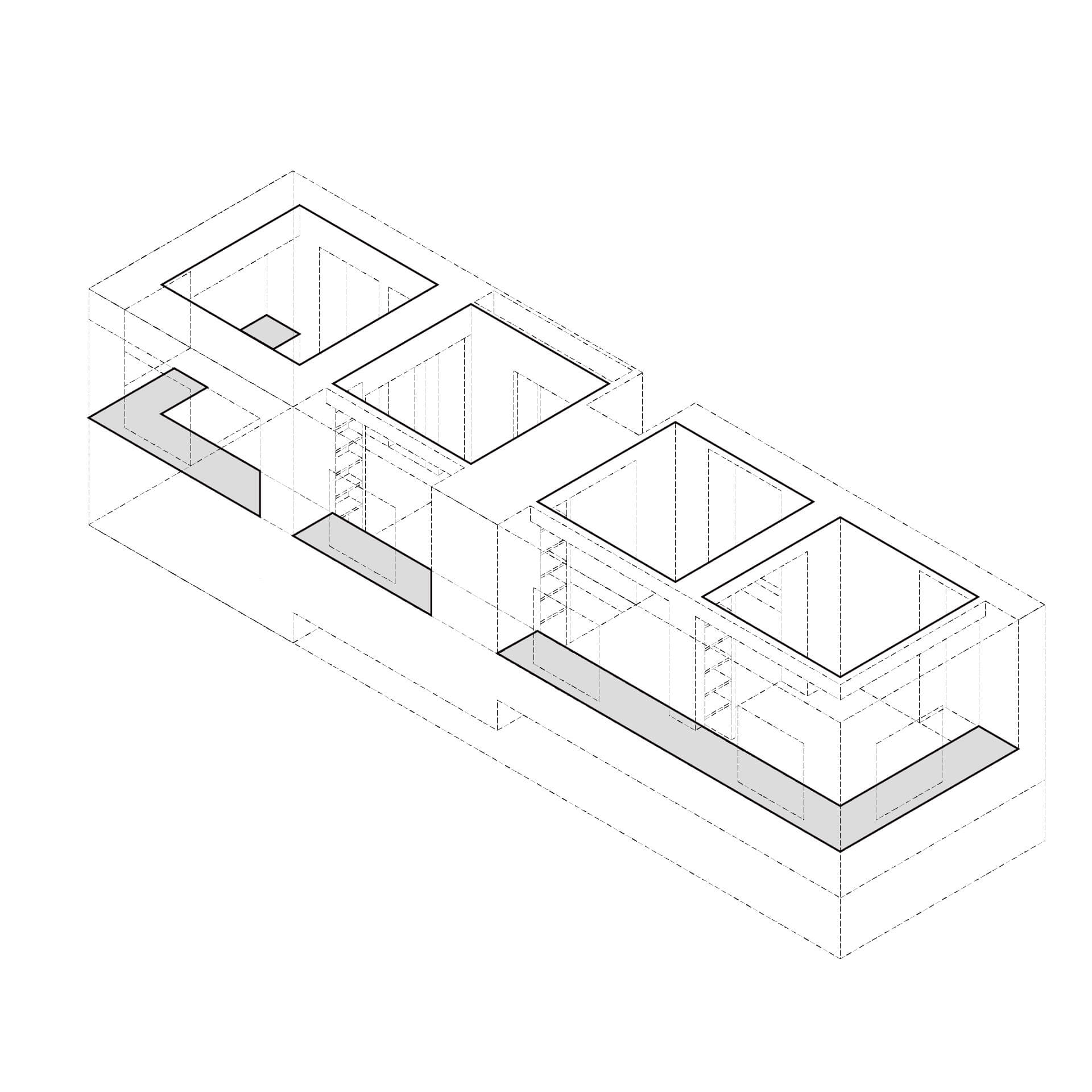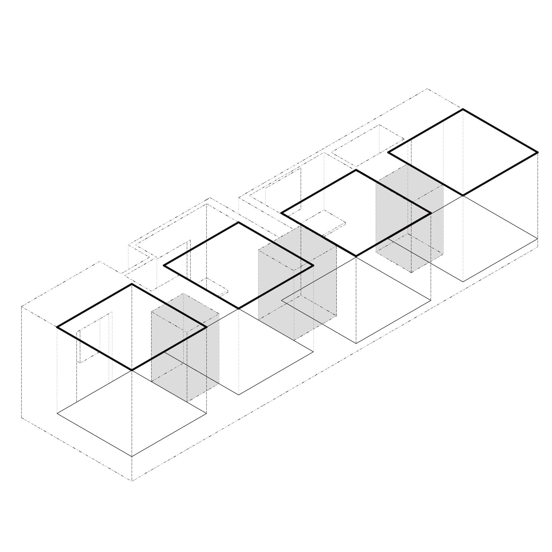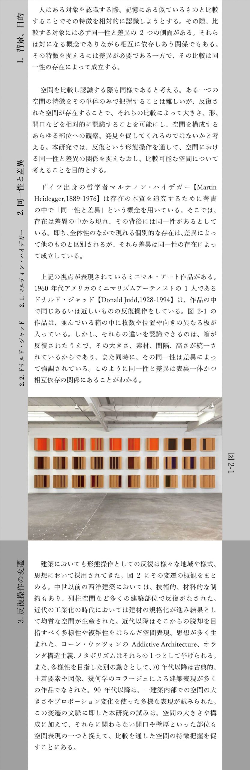 本研究は空間の比較を促す反復表現を試みるものである。単位空間の間に伸縮可能な緩衝空間を設け、室間の距離や開口等の隣室関係により室の特徴が決まる住宅を設計した。